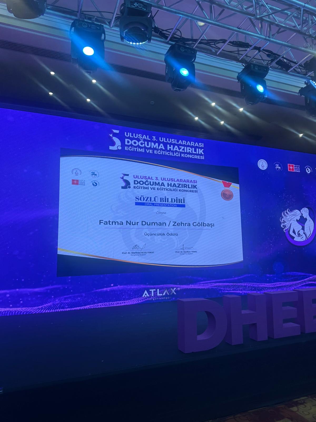 Lokman Hekim Üniversitesi Sağlık Bilimleri Enstitüsü Hemşirelik Anabilim Dalı Doğum ve Kadın Hastalıkları Hemşireliği Doktora Programı’nda yürütülen “Öz Yeterlilik Kuramına Dayalı Eş Katılımlı Doğuma Hazırlık Programının Doğum Korkusu, Öz Yeterliliği, Doğum Şekli ve Sonuçlarına Etkisi: Randomize Kontrollü Çalışma” başlıklı doktora tezi, 3. Uluslararası 5. Ulusal Doğuma Hazırlık Eğitimi ve Eğiticiliği Kongresi'nde ödüle layık görüldü.
