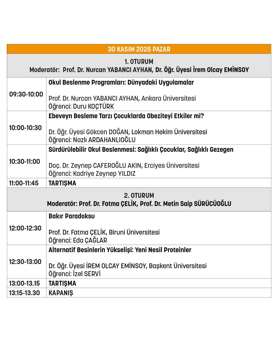 Alanında uzman akademisyenler tarafından yürütülen oturumlarda, her konu öğrenci sunumlarıyla desteklenerek tartışmaya açılacak; böylece genç araştırmacıların bilimsel üretime aktif katılımı teşvik edilecek. Programın ikinci gününde ise okul temelli beslenme modelleri, alternatif protein kaynakları ve tıbbi beslenme tedavilerinde güncel yaklaşımlar ele alınacak.