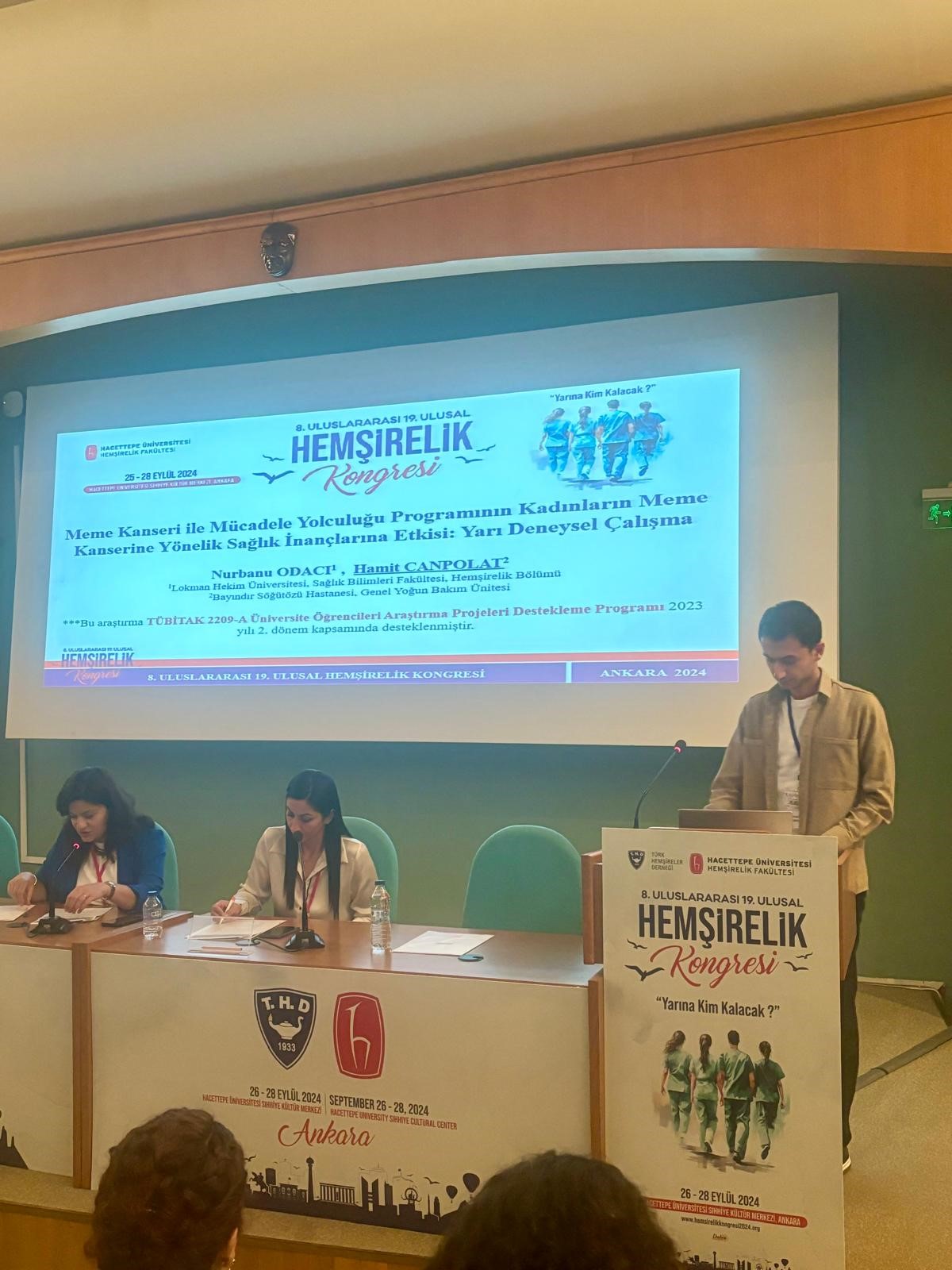 Mezun öğrencimiz Hamit CANPOLAT Öğr. Gör. Nurbanu ODACI danışmalığında,mezun öğrencimiz Bezen DUĞAN Arş. Gör. Hilal Merve BELEN danışmalığında yürüttükleri TÜBİTAK 2209-A projelerini 25-28 Eylül 2024 tarihleri arasında gerçekleştirilen 8.Uluslararası 19. Ulusal Hemşirelik Kongresi’nde sözel bildiri olarak sunmuştur.