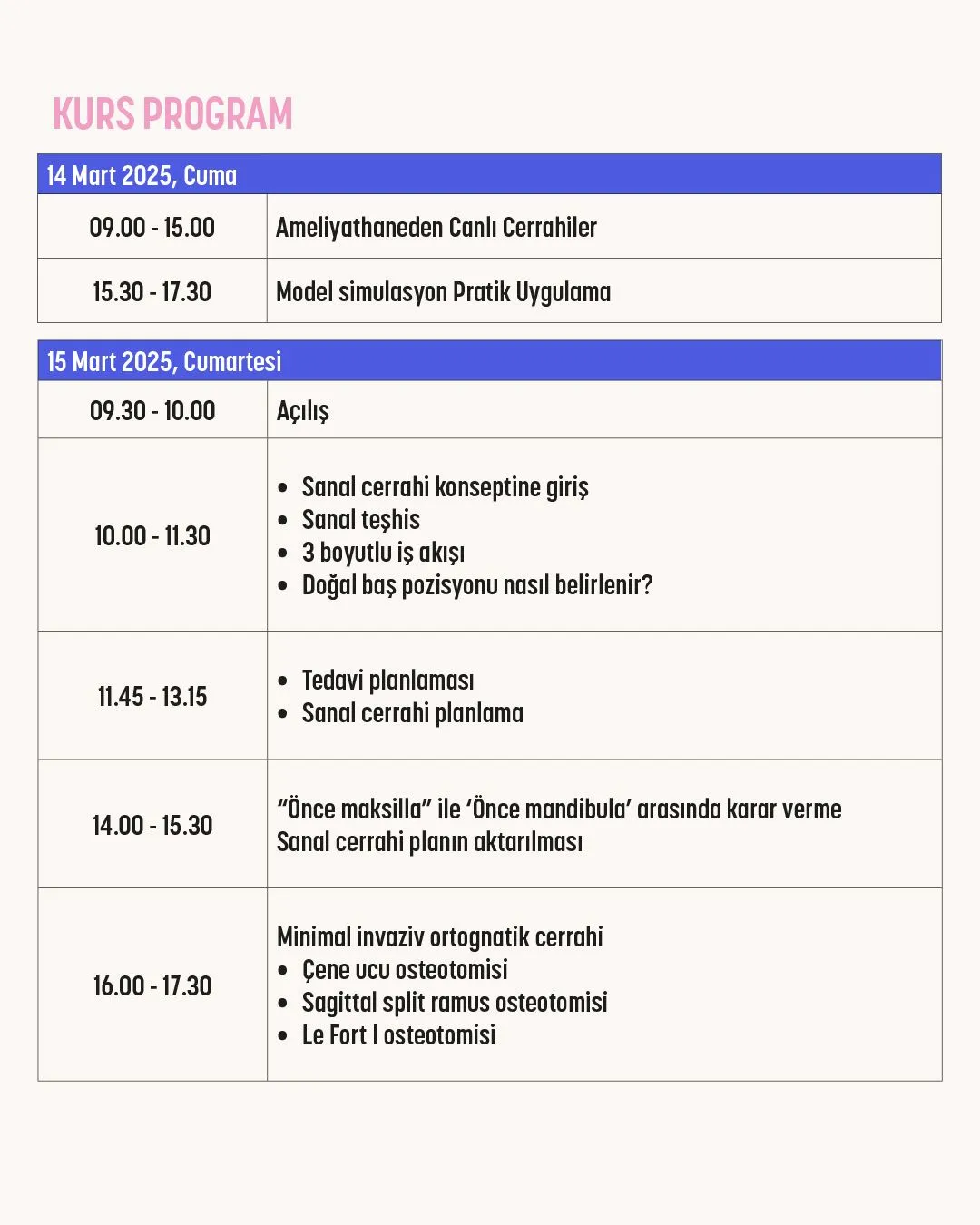 - Cerrahi Becerilerin Geliştirilmesi: Katılımcıların cerrahi tekniklerini geliştirmeyi ve uygulamalı deneyim kazandırmayı hedefler.