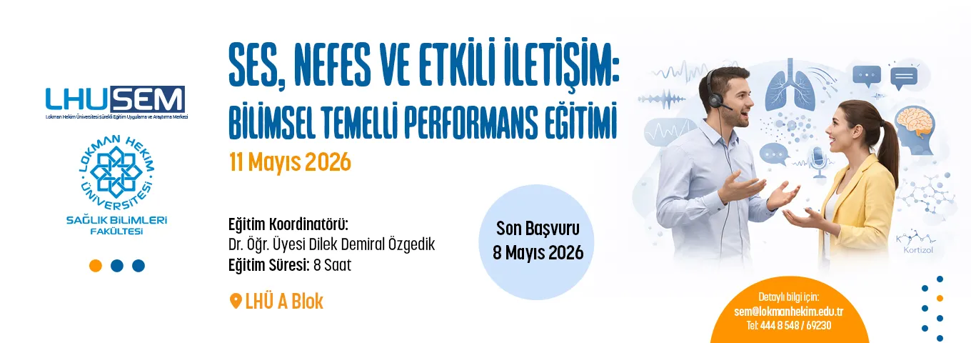 Lokman Hekim Üniversitesi Sürekli Eğitim Uygulama ve Araştırma Merkezi (LHÜSEM) tarafından düzenlenen bu eğitim programı; bilimsel temellere dayanan içeriği ve uygulama odaklı yaklaşımıyla katılımcıların iletişim, ses ve performans becerilerini geliştirmeyi hedeflemektedir.