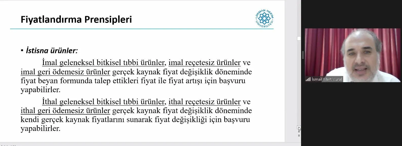 Lokman Hekim Üniversitesi Sürekli Eğitim Merkezi (LHUSEM) ve Lokman Hekim Üniversitesi Sağlık Ekonomisi ve Sağlık Teknolojileri Uygulama Merkezi(LHUSESAT) tarafından düzenlenen "Pazar Erişiminde Fiyatlandırma Kursu" 25-27 Kasım 2021 tarihlerinde online uzaktan eğitim sistemi kullanılarak gerçekleştirildi. Program Konu Başlıkları:| 1. Gün | ||