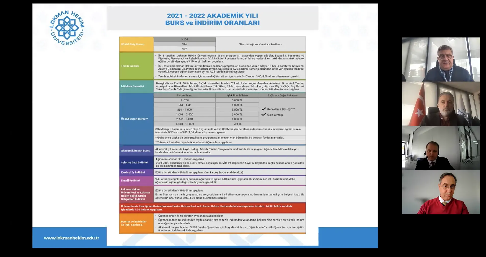 Üniversitemiz Kalite Güvence Sisteminin sürekli gelişimini sağlamak, eğitim-öğretim, araştırma-geliştirme, toplumsal katkı ve girişimcilik faaliyetlerine ilişkin mevcut durum analizini yapmak, iyileştirmeye açık yönleri tespit edebilmek ve geleceğe yönelik planlamalar yapabilmek amacıyla değerli dış paydaşlarımızın görüş ve önerilerini almak üzere, 17 Şubat 2022 tarihinde I. Dış Paydaş Toplantısı online olarak gerçekleştirilmiştir. Sayın Mütevelli Heyeti Başkanımız Dr. Mehmet ALTUĞ, Rektörümüz Prof. Dr. Bülent GÜMÜŞEL, Rektör Danışmanımız Dr. Fazıl Serdar GÜREL ve Eğitim Öğretim Daire Başkanımız Doç. Dr. Mevlüt KARADAĞ’ın başkanlığında gerçekleşen toplantıya, MİA Yaşam Merkezinden, meslek odalarından, sanayi kuruluşlarından, yurt içi üniversitelerden, sivil toplum kuruluşlarından ve araştırma kurumlarından temsilciler katılım sağlamıştır. Toplantı esnasında paydaşlarımız Üniversitemiz ile ilgili tecrübelerini paylaşmış, Üniversitemiz kalite çalışmalarındaki başarısının ve etkin iş birliği ile yürütülen faaliyetlerin önemini vurgulamıştır. Bu doğrultuda özellikle iş birliğinin artırılması ve her alanda ilişkilerin geliştirilmesine yönelik öneriler sunulmuştur. Ayrıca paydaşlarımızın üniversitemizden beklentilerini tespit edebilmek ve geleceğe yönelik planlamalar yapabilmek amacıyla hazırlanan “Lokman Hekim Üniversitesi Dış Paydaş Anketi” toplantı sonunda katılımcılara iletilmiştir. Üniversitemiz, katılımcı bir anlayış çerçevesinde dış paydaşlardan alınan görüş ve öneriler vasıtasıyla, eğitim-öğretim, araştırma-geliştirme, toplumsal katkı ve girişimcilik faaliyetlerinin geliştirilmesi ve iyileştirilmesine yönelik çalışmalarını aralıksız sürdürmektedir.