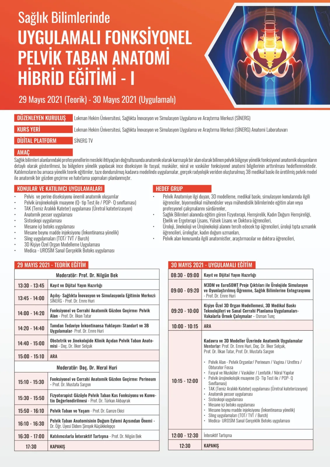 Lokman Hekim Üniversitesi Sağlıkta İnovasyon ve Simülasyonla Eğitim, Uygulama ve Araştırma Merkezi (SİNERG) bünyesinde Sağlık Bilimlerinde Uygulamalı Fonksiyonel Pelvik Taban Anatomi Hibrid Eğitimi- 1 29 Mayıs – 30 Mayıs 2021 tarihleri arasında gerçekleştirilecektir.