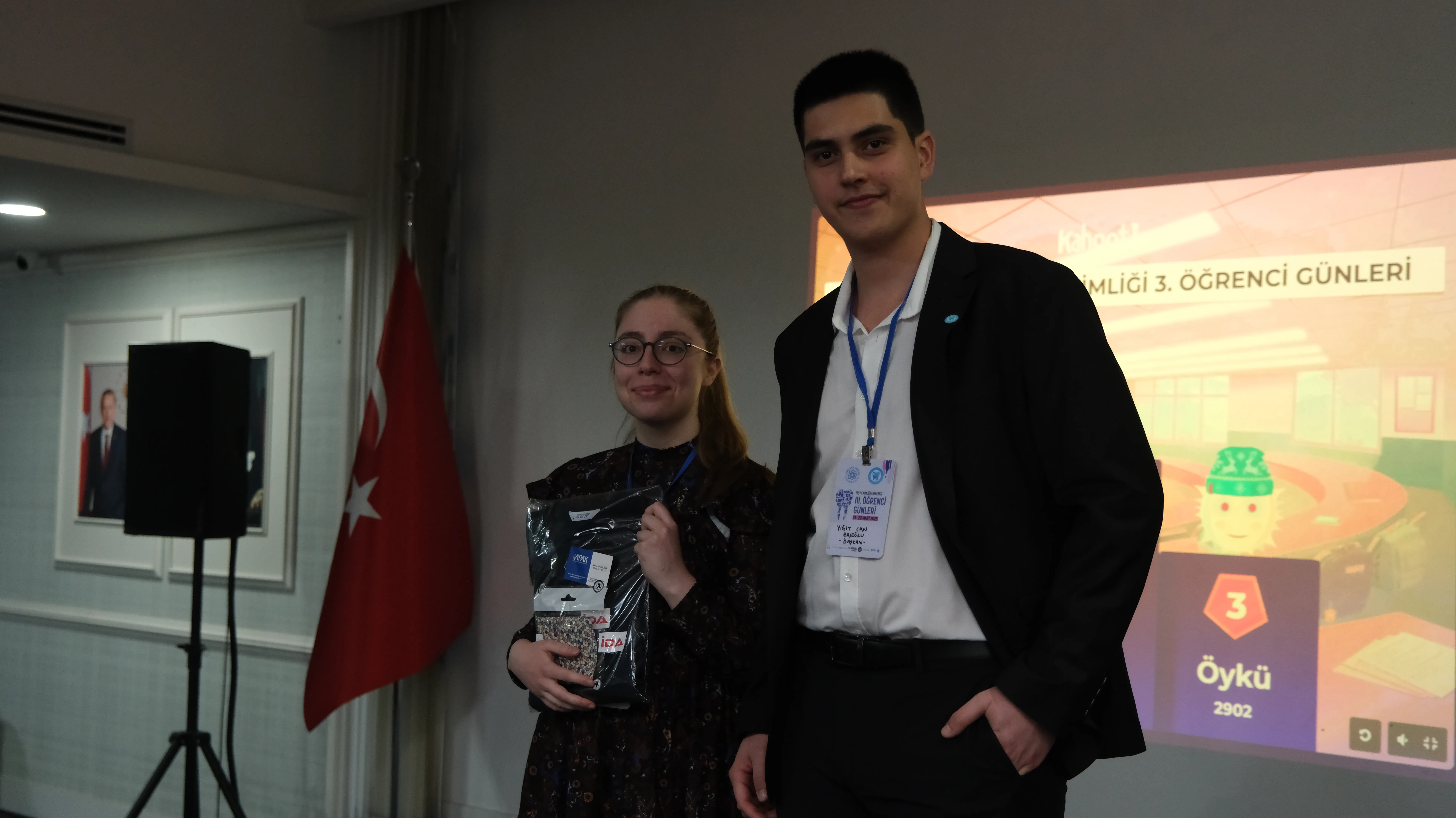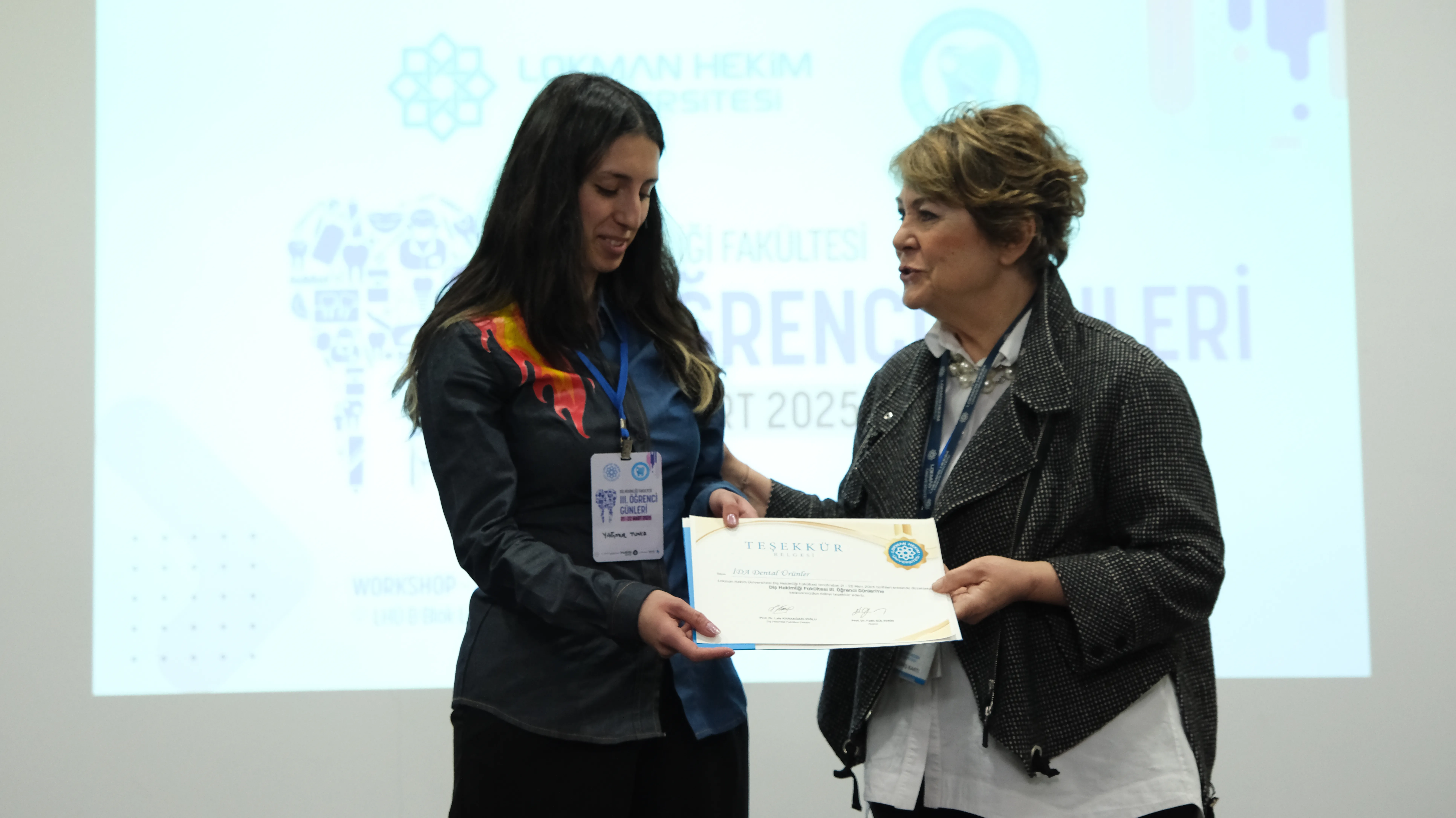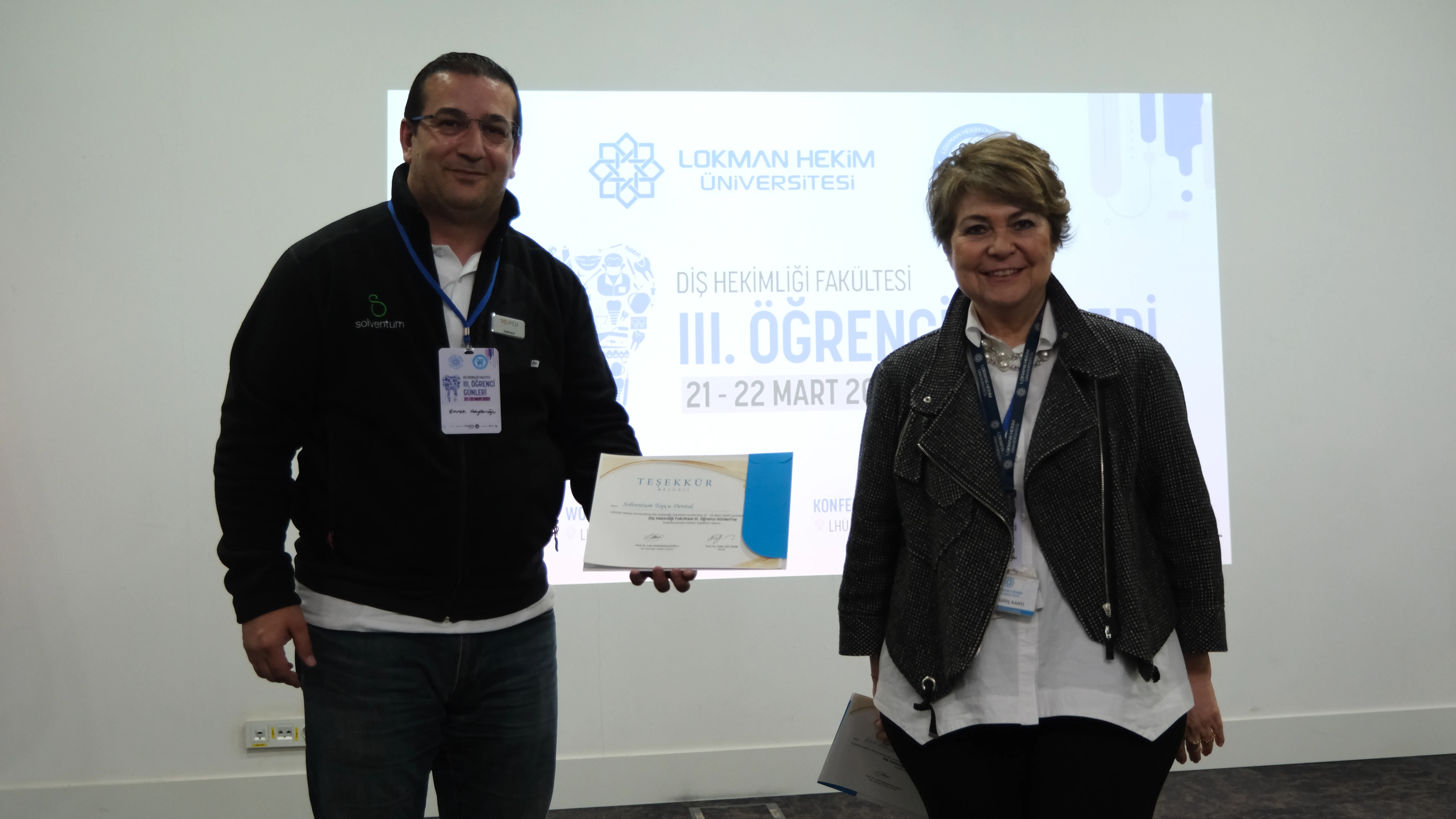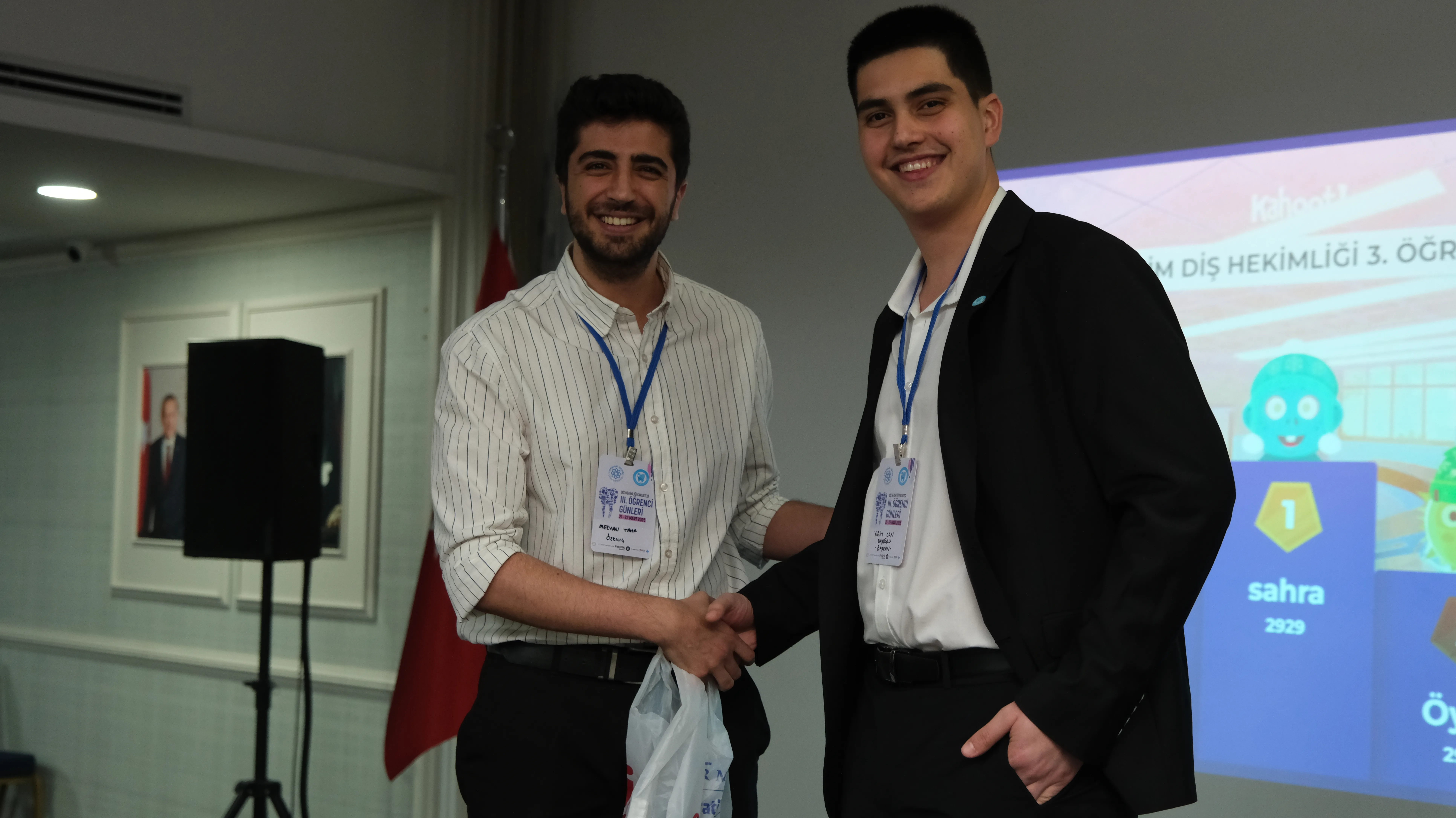 Bilgi Yarışması ve Ödül Töreni: Etkinliğin sonunda, katılımcılar arasında web tabanlı bir uygulama üzerinden gerçekleştirilen etkileşimli bilgi yarışması ile hem eğlenceli hem de öğretici bir atmosfer oluşturulmuştur. Diş hekimliği alanına yönelik sorularla bilgilerini yarıştıran öğrencilerden en yüksek puanı alanlara ödülleri takdim edilmiştir. Yarışma ödülleri, sponsor firmaların katkılarıyla Diş Hekimliği Öğrenci Topluluğu tarafından temin edilmiştir. Sponsorlarımıza teşekkür belgeleri takdim edilmiştir.