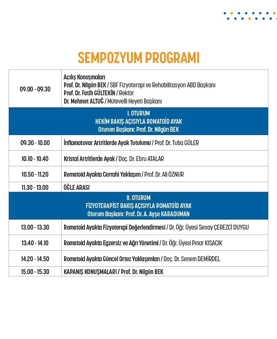 Sempozyum programı kapsamında; inflamatuvar ve kristal artritlerde ayak tutulumu, romatoid ayakta cerrahi yaklaşımlar gibi başlıklar hekim bakış açısıyla ele alınacaktır. Günün ikinci bölümünde ise fizyoterapi değerlendirmesi, egzersiz uygulamaları, ağrı yönetimi ve güncel ortez yaklaşımları detaylı şekilde tartışılacaktır.
