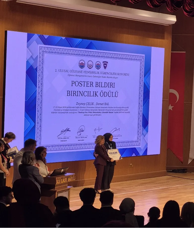 Hemşirelik Bölümü 3. sınıf öğrencilerimizden Zeynep Çelik, Dr. Öğr. Üyesi Demet BAL danışmanlığında hazırladığı “DozKap Pro: Pilsiz Mekanizma, Güvenilir Bakım” isimli çalışması 17-18 Nisan 2026 tarihinde gerçekleştirilen 2. Ulusal Gülhane Hemşirelik Öğrencileri Kongresi’nde poster bildiri birincilik ödülü almıştır.