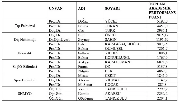 "Lokman Hekim Üniversitesi Akademik Personel Performans Değerlendirme Yönergesi" çerçevesinde üniversitemiz bünyesinde kadrolu olarak en az 1 yıl süreyle görev yapan tüm öğretim elemanlarımızın, Ocak 2021 - Aralık 2021 dönemini kapsayacak şekilde eğitim faaliyetleri, akademik ve bilimsel faaliyetleri, üniversiteye katkı/idari görevleri esas alınarak hazırlanan “Akademik Performans” formları değerlendirilmiştir.