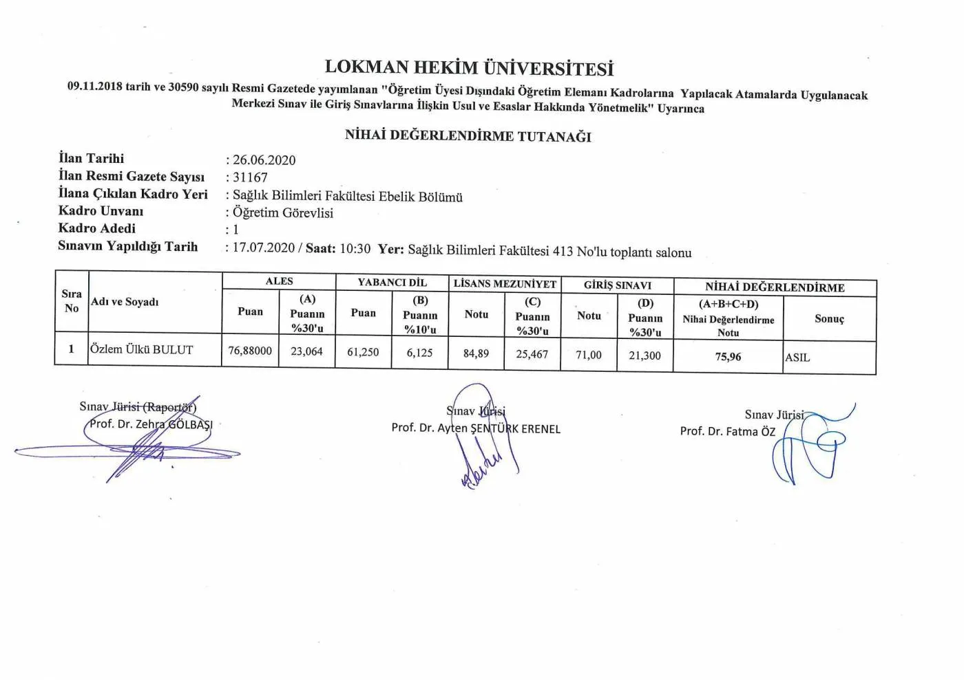 Sağlık Bilimleri Fakültesi Ebelik Bölümü Öğretim Görevlisi Alımı Nihai Değerlendirme