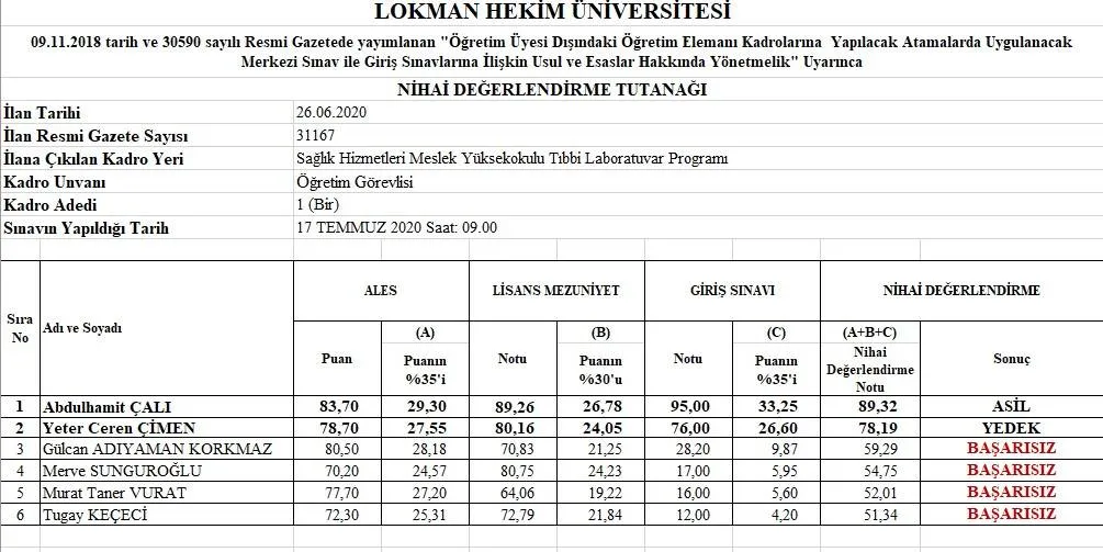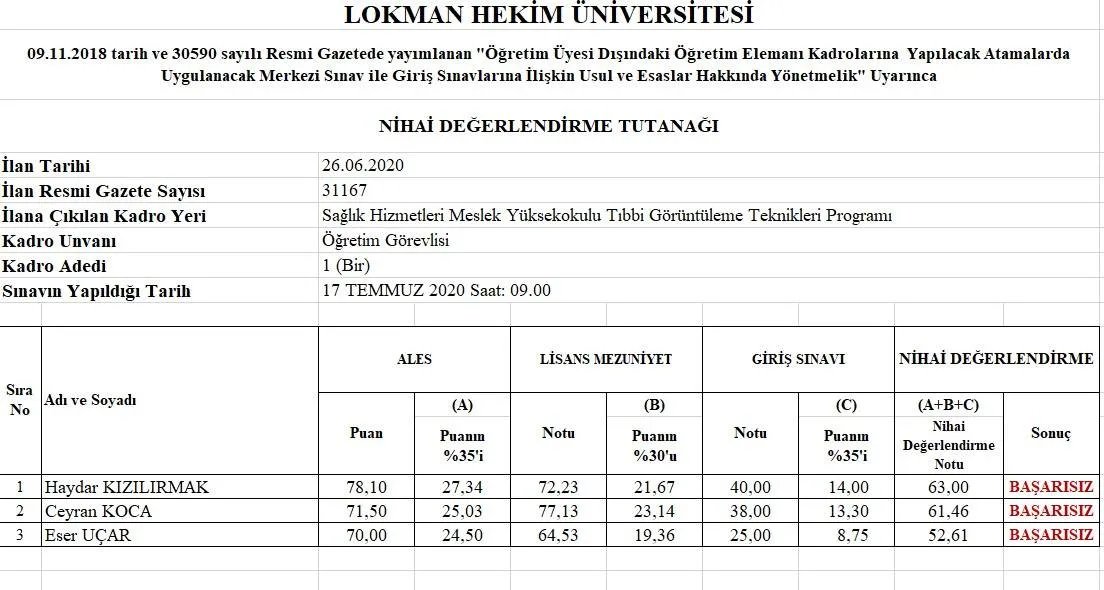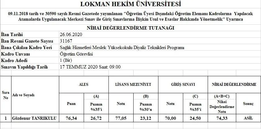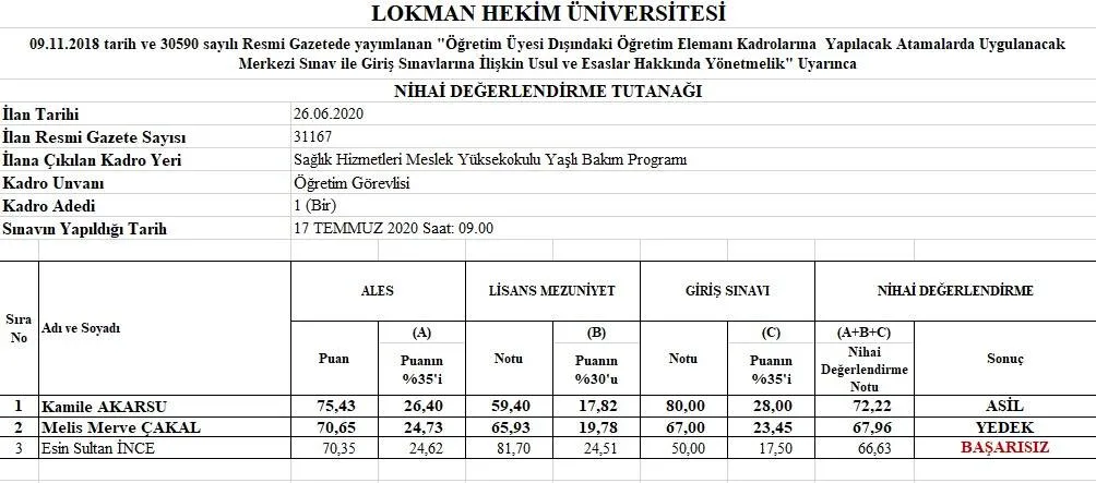 Sağlık Hizmetleri Myo Öğretim Görevlisi Alımı Nihai Değerlendirme Sonucu
