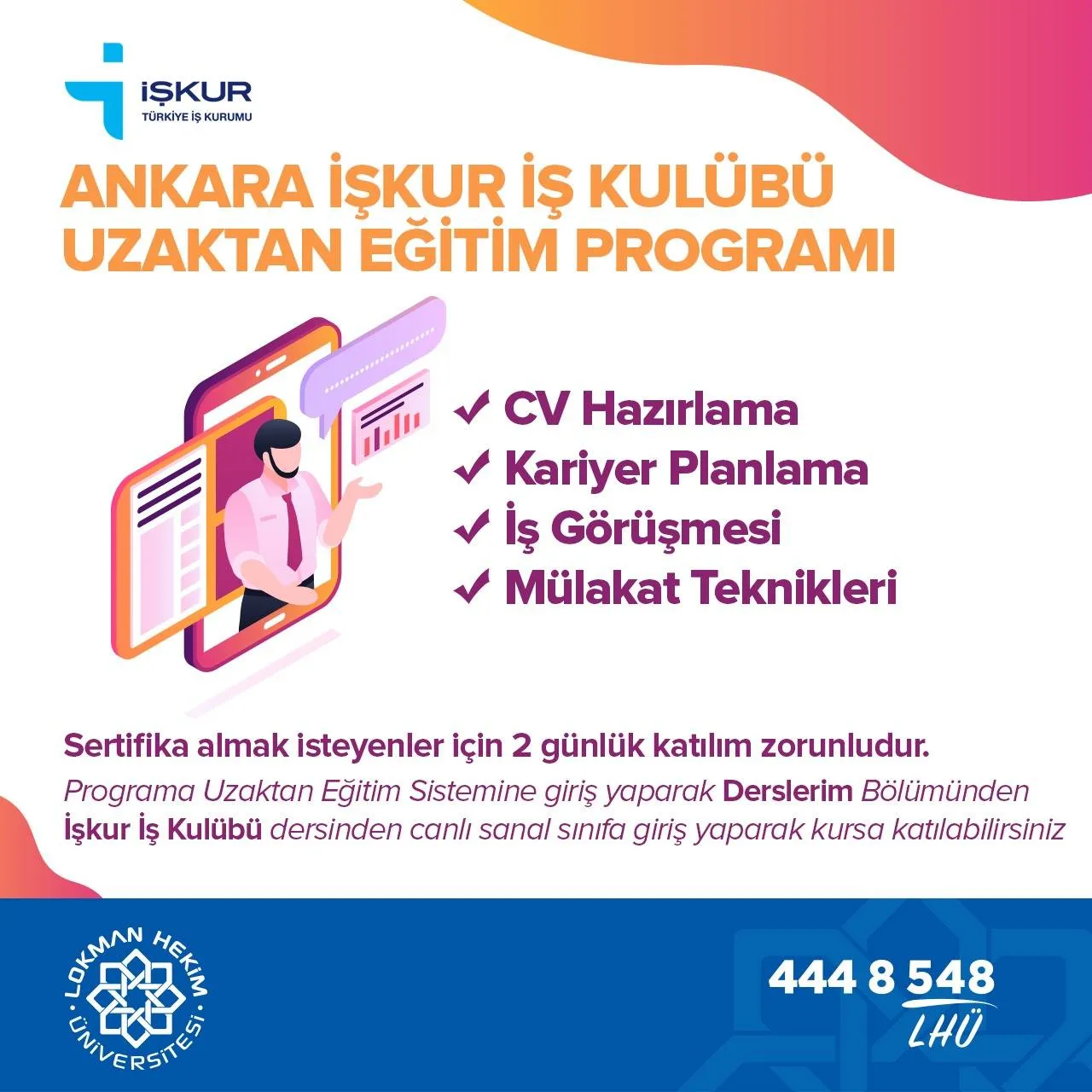 Üniversitemiz ile İŞKUR arasında geliştirilen kariyer programı kapsamında “İŞ KULÜBÜ EĞİTİM PROGRAMI’nın” gelecek hafta itibarı ile başlattığımızı büyük bir mutlulukla paylaşmak isteriz. Sağlık sektörünün eleman ihtiyacına cevap verecek nitelik ve yetkinlikte gelişiminize yardımcı olacak özgeçmiş hazırlama, kariyer planlama, iş görüşmesi ve mülakat konularını içeren “Ücretsiz Sertifika” eğitim programımız https://eys.lokmanhekim.edu.tr/ adresindeki sanal sınıfta online öğrenime açılmıştır.