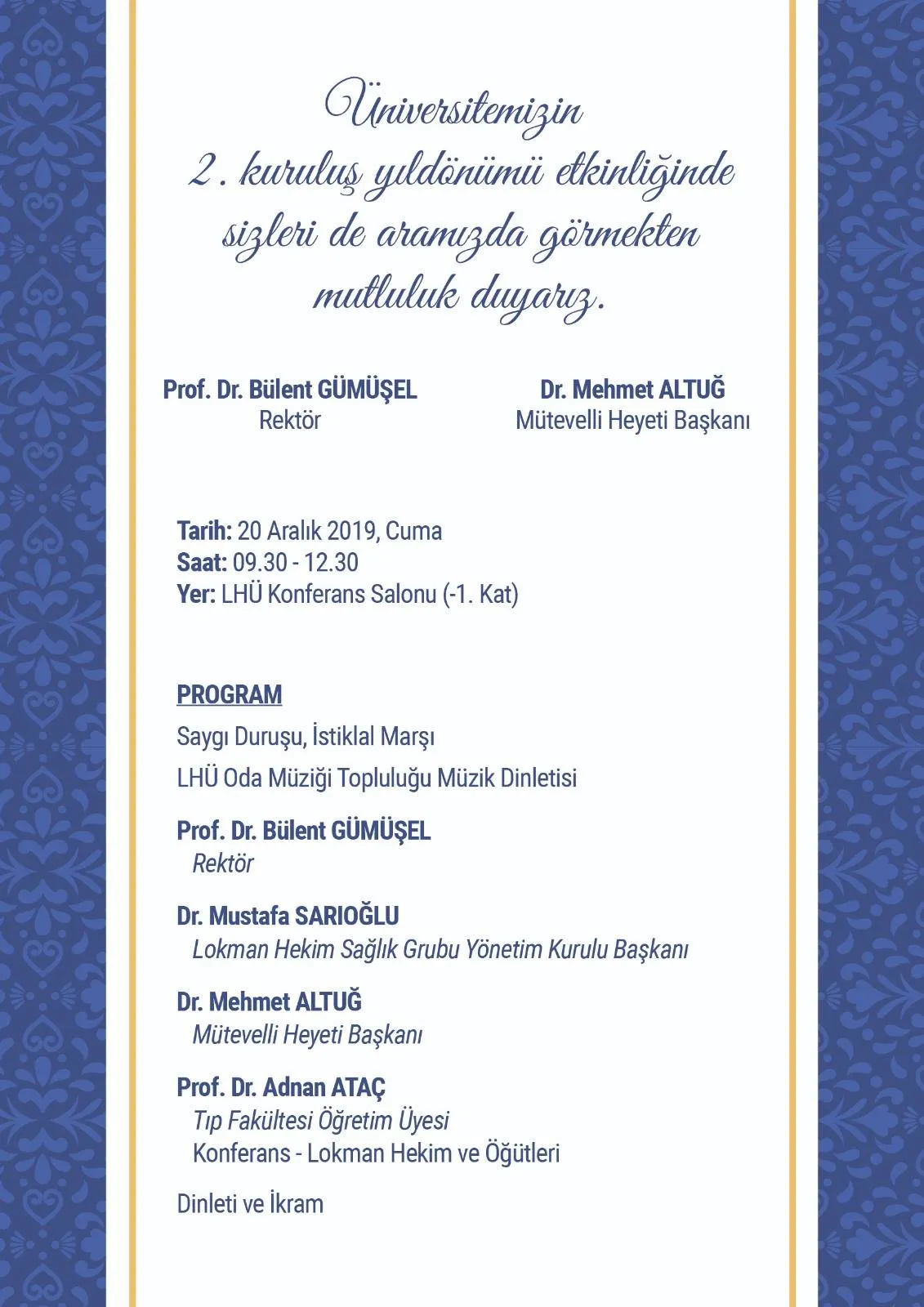 Sayın Lokman Hekim Üniversitesi Ailesi ve Sevgili Öğrencilerimiz, Üniversitemizin 2. kuruluş yıldönümü etkinliğimiz 20 Aralık 2019, Cuma günü 09.30-12.30 saatleri arasında -1. kat Konferans Salonunda yapılacaktır. Program ektedir. Katılımınızdan mutluluk duyacağız. Saygılarımızla, Lokman Hekim Üniversitesi