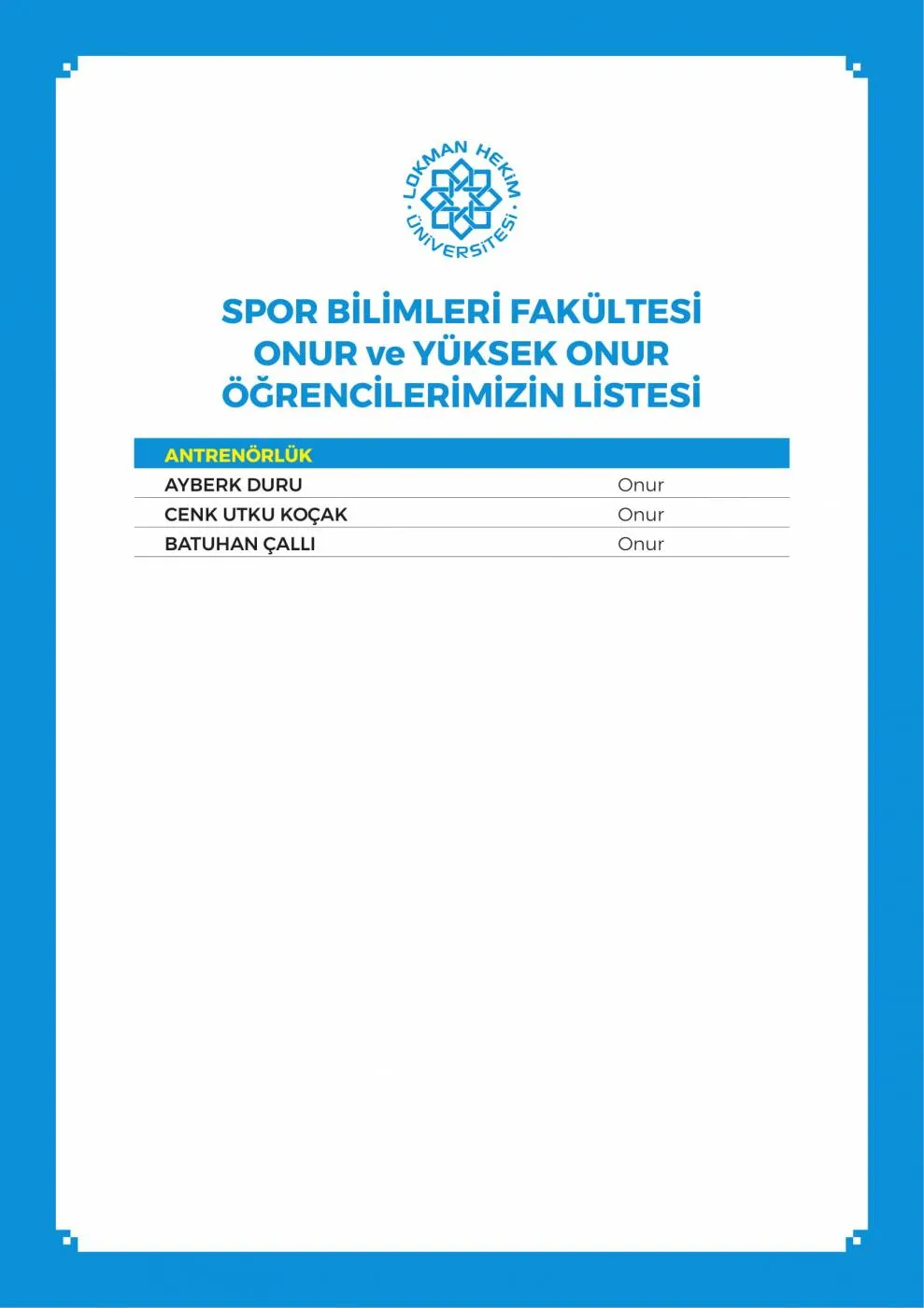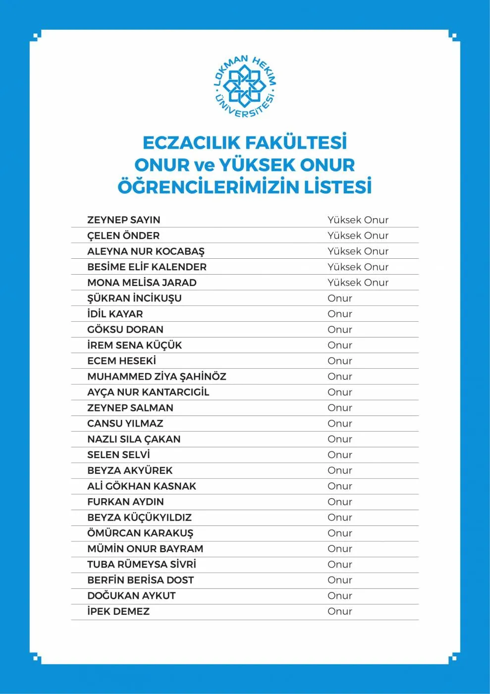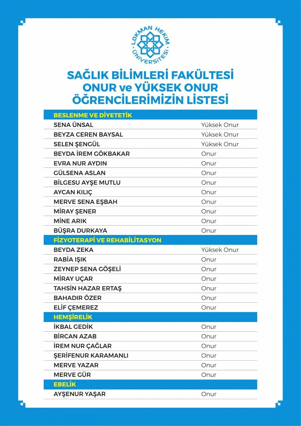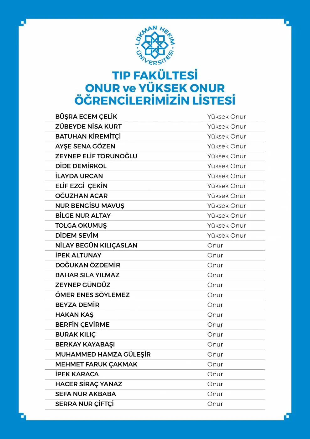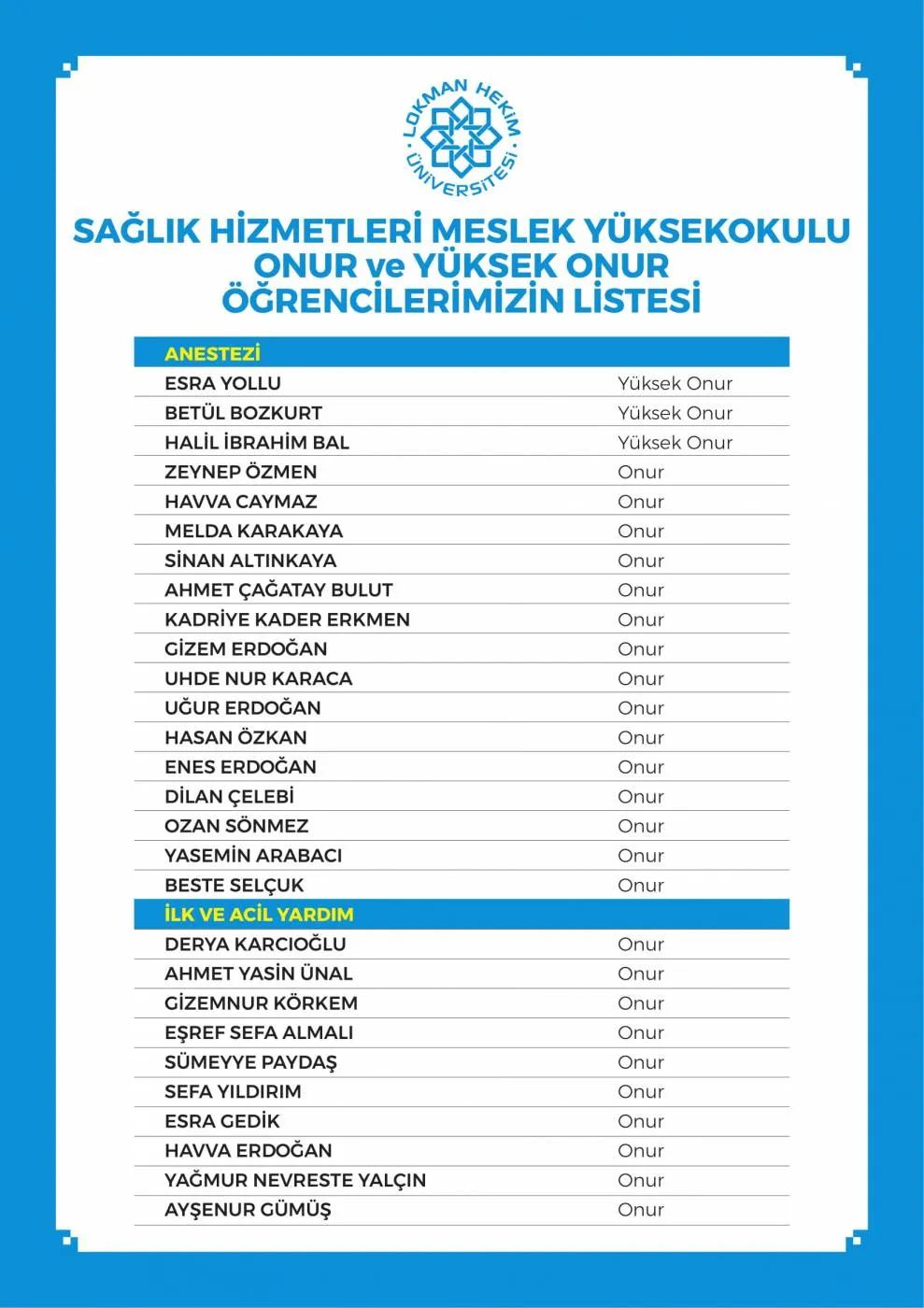 LHÜ Yüksek Onur Ve Onur Öğrencileri Listesi