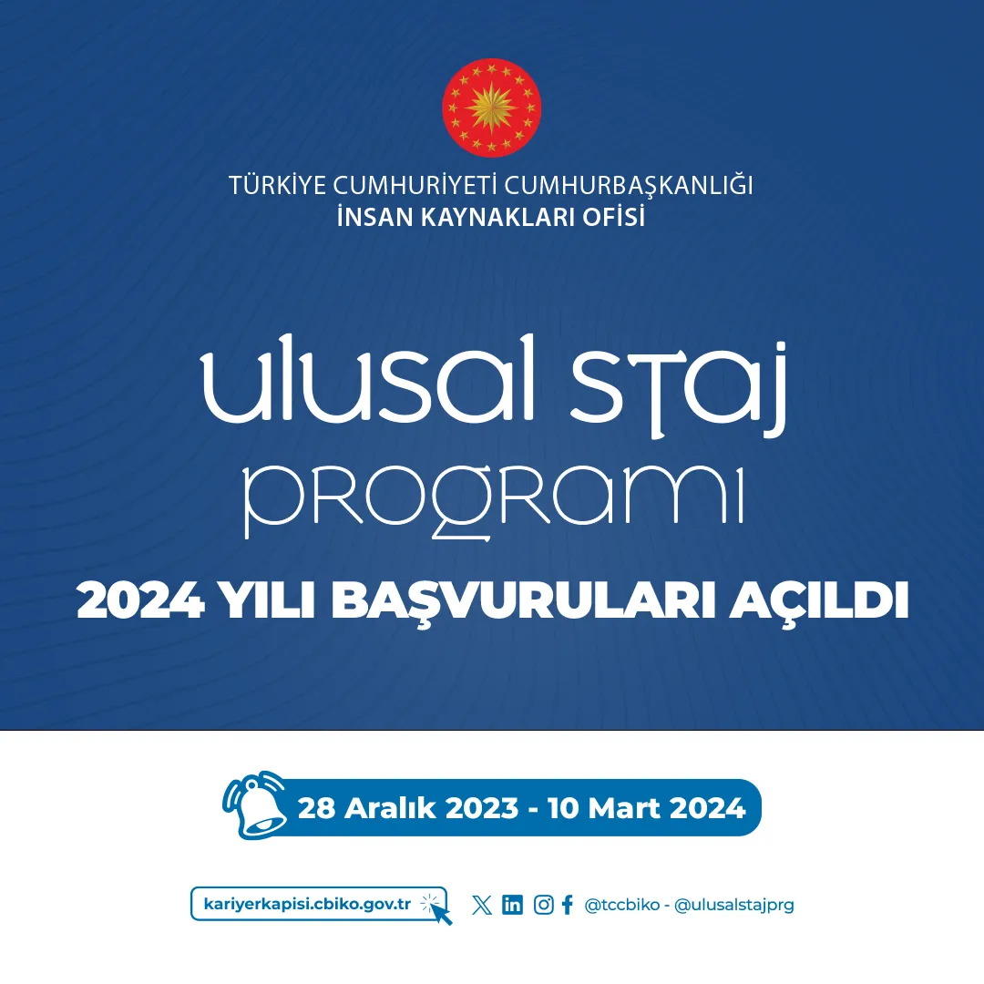 Cumhurbaşkanlığı İnsan Kaynakları Ofisi koordinasyonunda, tüm kamu kurumları ve özel sektörden gönüllü işverenlerin katılımı ile yükseköğretimde sürdürülen Ulusal Staj Programı 2024 yılı başvuruları başlamış olup, 10 Mart 2024 tarihine kadar devam edecektir.