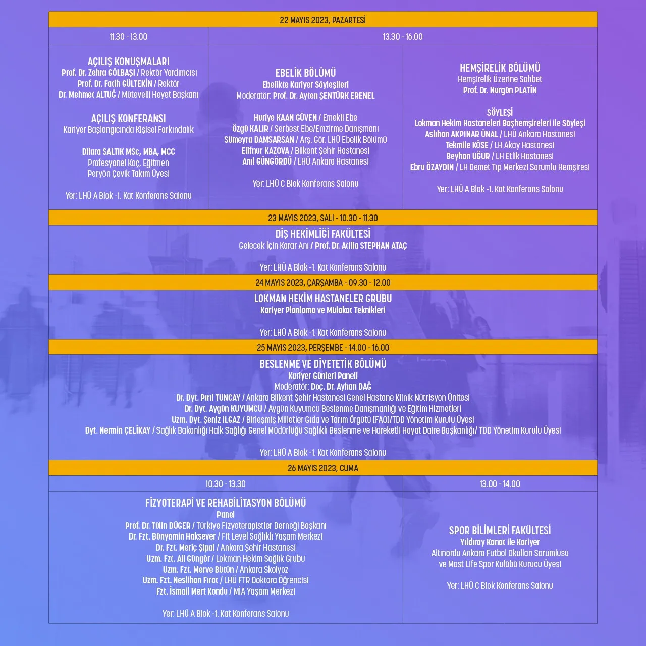 Lokman Hekim Üniversitesi Kariyer Planlama ve Mezun İzleme Birimi tarafından bu yıl ikincisi düzenlenen “Kariyer Günleri” 22-26 Mayıs 2023 tarihleri arasında Üniversitemizin A ve C Bloklarında yer alan konferans salonlarında gerçekleştirilecektir.