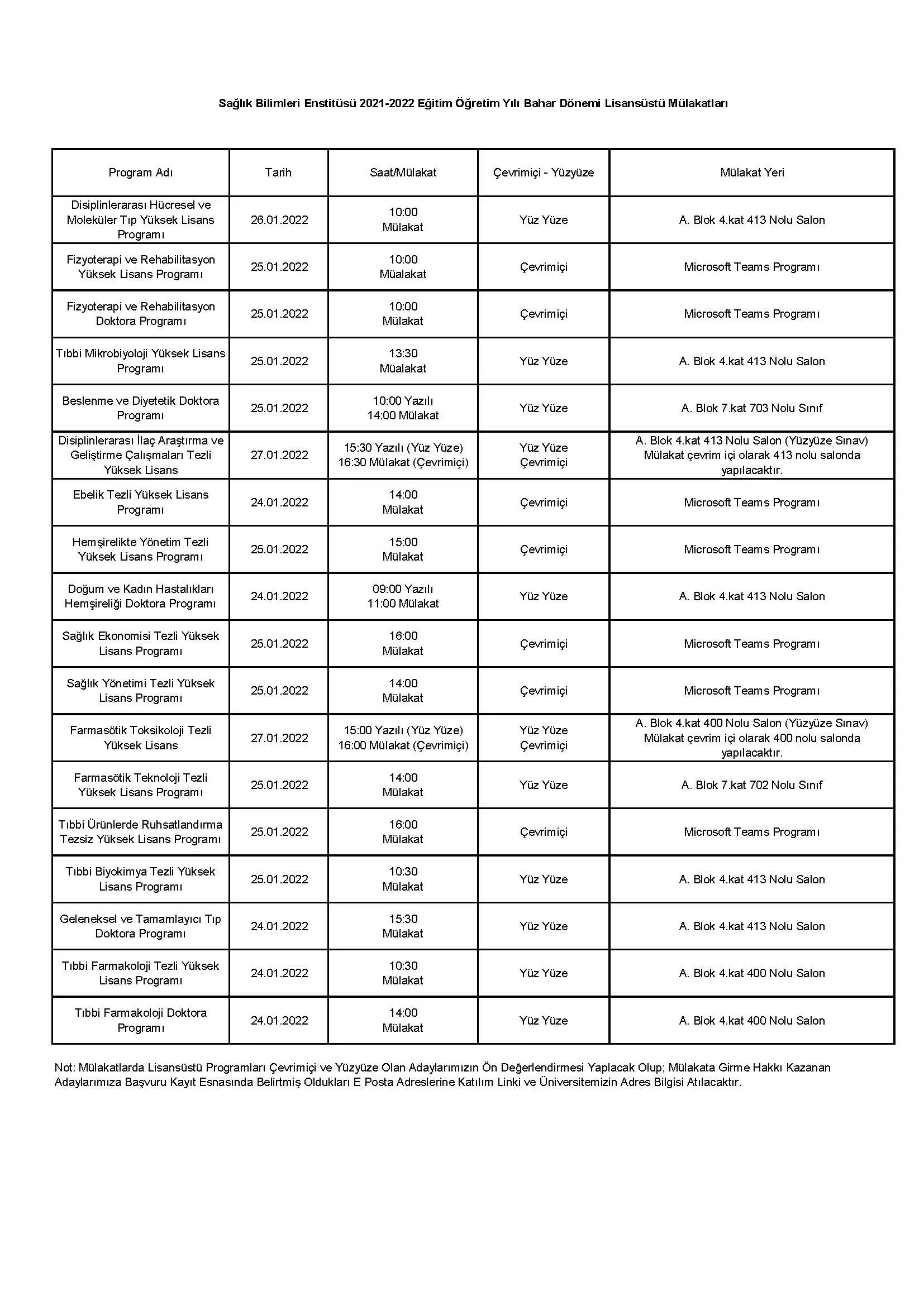 2021-2022 Eğitim Öğretim Yılı Bahar Dönemi Lisansüstü Mülakatları Hk.