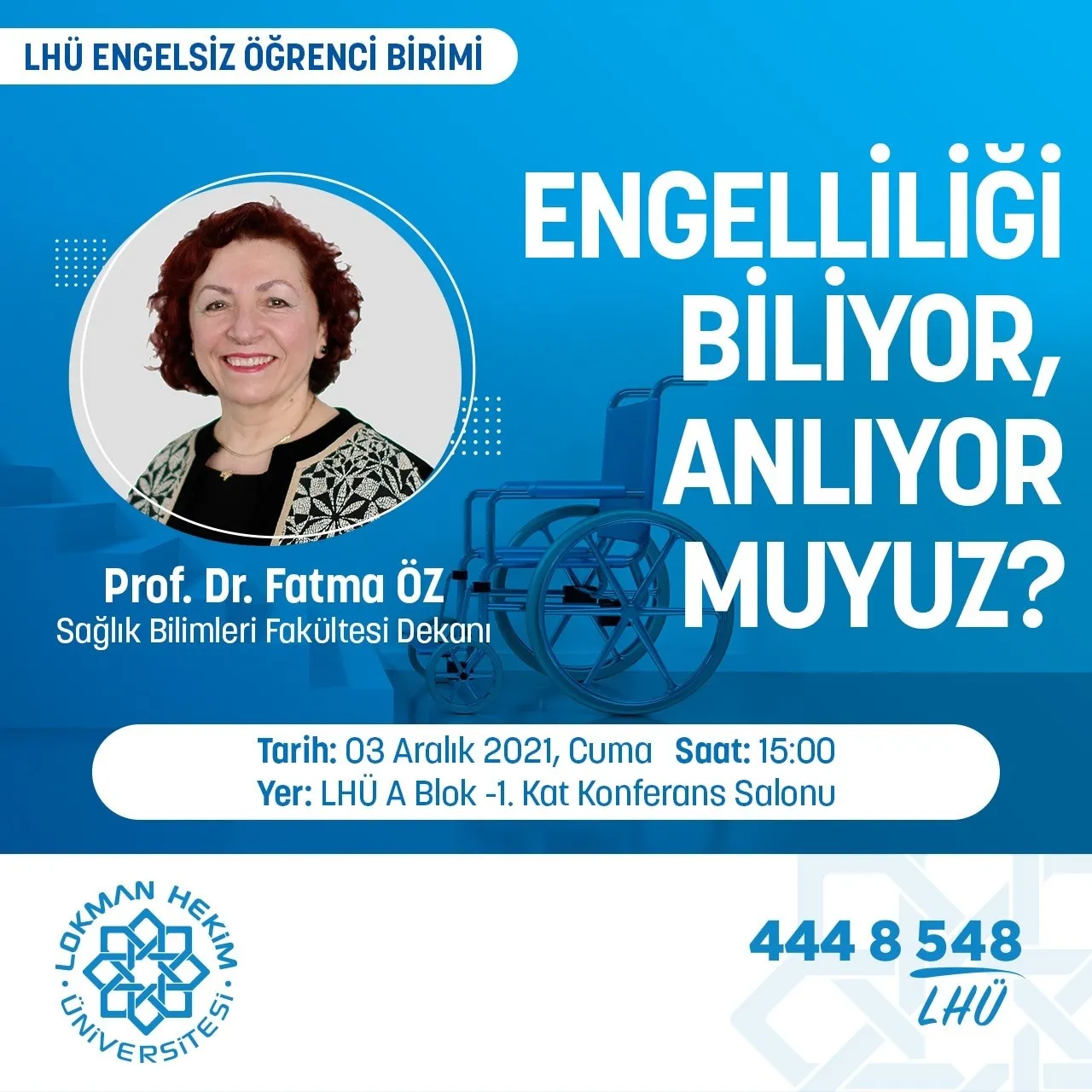 Sayın Lokman Hekim Üniversitesi Ailesi, 3 Aralık Dünya Engelliler Günü etkinlikleri kapsamında Lokman Hekim Üniversitesi Engelsiz Öğrenci Birimi tarafından gerçekleştirilecek olan ”Engelliliği Biliyor, Anlıyor Muyuz?” başlıklı konferansımız Sağlık Bilimleri Fakültesi Dekanı Prof. Dr. Fatma ÖZ tarafından 3 Aralık 2021 Cuma günü LHÜ A Blok -1. Kat Konferans Salonunda saat 15:00’de gerçekleştirilecektir. Katılımınızdan büyük mutluluk duyacağız. Saygı ve sevgilerimizle, Lokman Hekim Üniversitesi