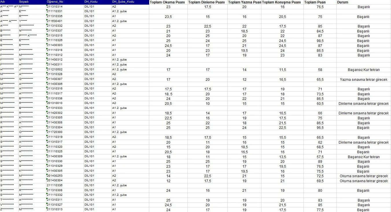 Türkçe Hazırlık A1 ve A2 Kurlarının Ara Sınav Sonuçları