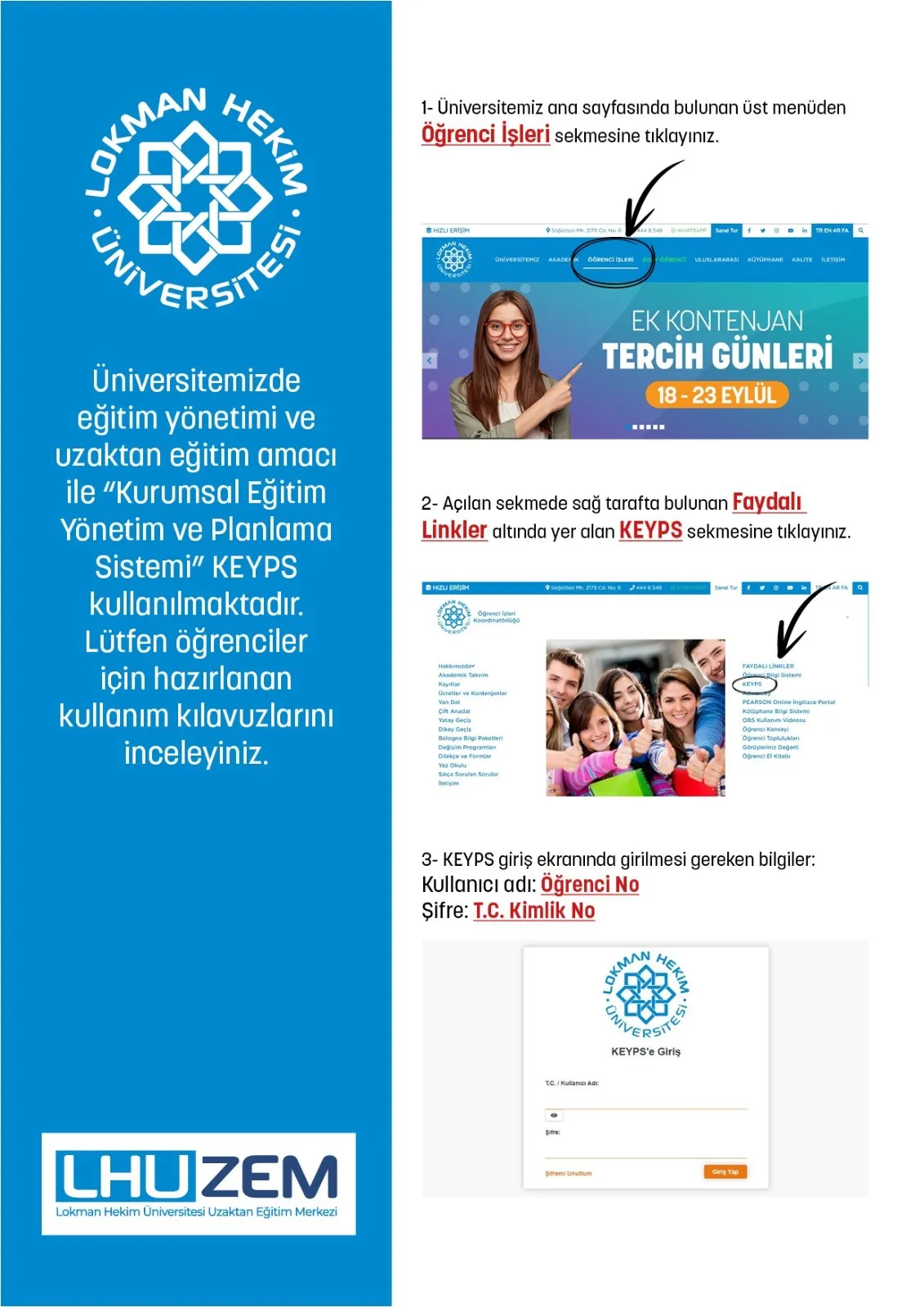 Üniversitemiz Yönetimi tarafından 2021-2022 Eğitim Öğretim Yılı Güz Dönemi Akademik Yılında belirlenen eğitim, öğretim ve sınav faaliyetlerimizde Uzaktan Eğitim Sistemi olarak “KEYPS sistemi” kullanılarak, eş zamanlı-canlı-senkron olarak dersler gerçekleştirecek ve sınavlar yapılacaktır. Bu bağlamda sistemi önceden kullanan öğrencilerimiz ve yeni kayıt olan öğrencilerimiz için 2 ayrı kılavuz hazırlanarak Uzaktan Eğitim Sistemimizin sizler tarafından kullanımınızı kolaylaştırmayı hedefledik.