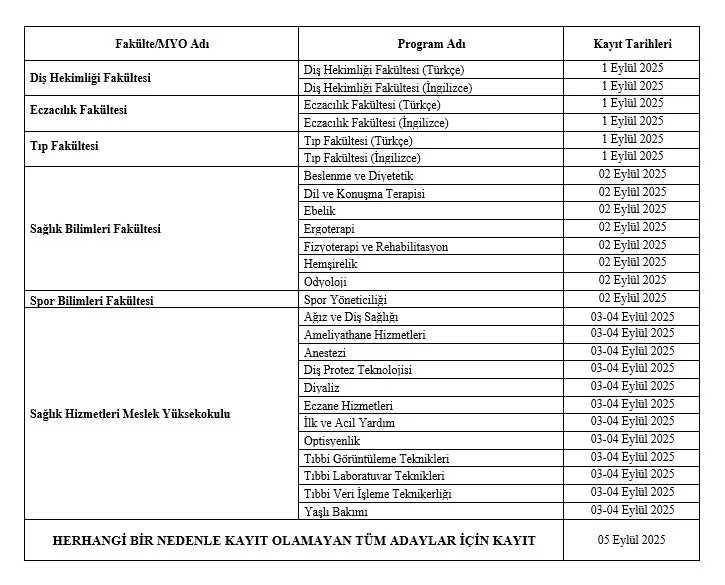 E-kayıt yapamayan adaylar, 01-05 Eylül 2025 tarihlerinde 09:00 ile 18:00 saatleri arasında Üniversite Öğrenci İşleri Koordinatörlüğünde yüz yüze kayıt yaptıracaklardır.