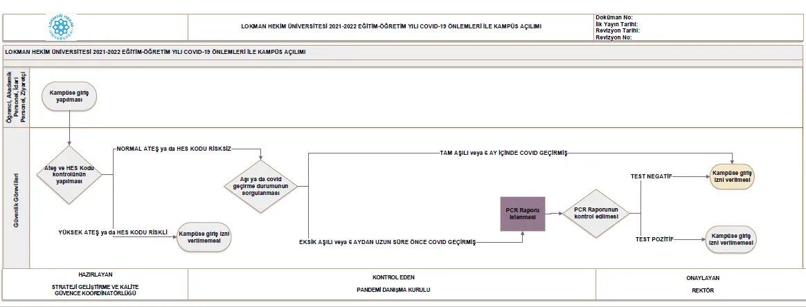 Üniversitemiz Pandemi Danışma Kurulu'nun 16 Ağustos 2021 Pazartesi günü yapmış olduğu toplantıda güvenli kampüs ortamı oluşturmak, bireysel/toplumsal sağlığı korumak ve sürdürmek amacıyla 2021 - 2022 Eğitim - Öğretim yılı için alınan kararlar şöyledir; Genel Önlemler- Hastalık semptomları olan veya COVID-19 PCR pozitif olanlar kampüse ve sınıflara alınmamalıdır.