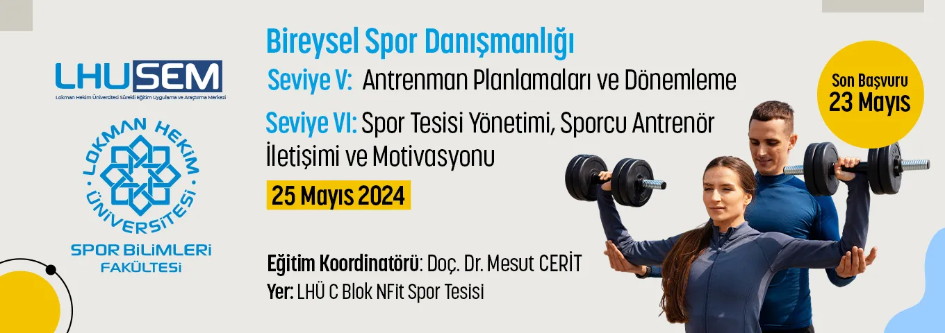 Lokman Hekim Üniversitesi Sürekli Eğitim Merkezi (LHUSEM) ve Spor Bilimleri Fakültesi iş birliği ile 16 Aralık 2023- 9 Haziran 2024 tarihleri arasında yüz yüze Bireysel Spor Danışmanlığı, Genetik ve Atletik Performans Gelişimi Eğitim Programları gerçekleştirilecektir.