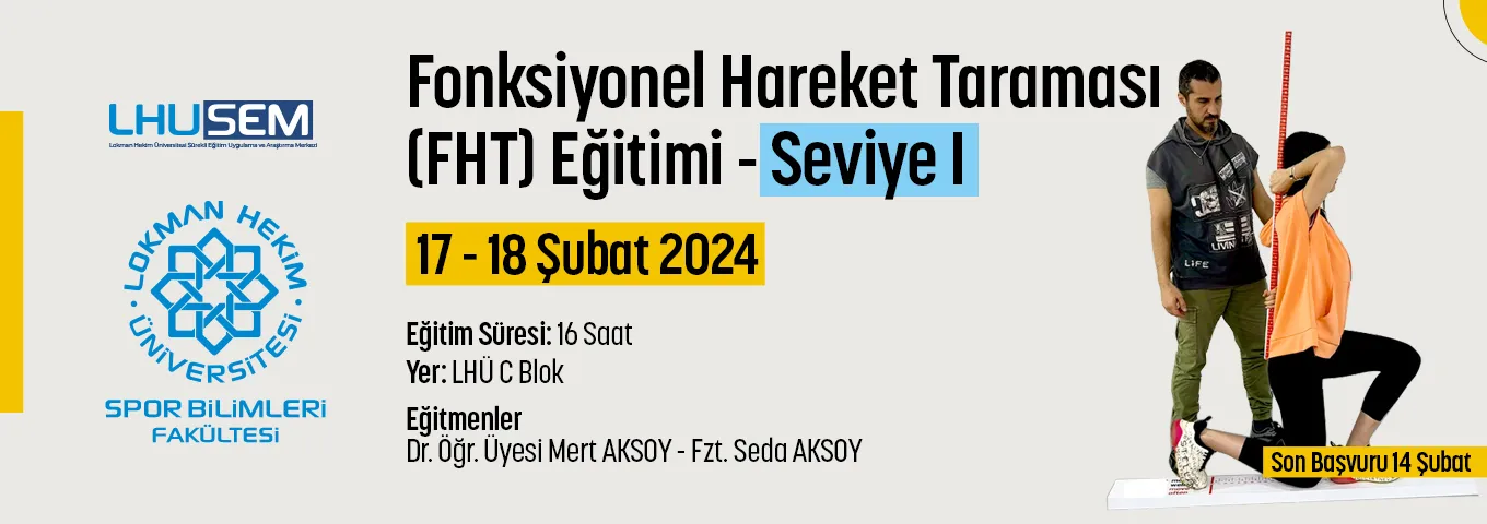 Lokman Hekim Üniversitesi Sürekli Eğitim Merkezi (LHUSEM) ve Spor Bilimleri Fakültesi iş birliği ile 17-18 Şubat 2024 tarihlerinde yüz yüze Fonksiyonel Hareket Taraması (FHT) Eğitim Programı gerçekleştirilecektir.