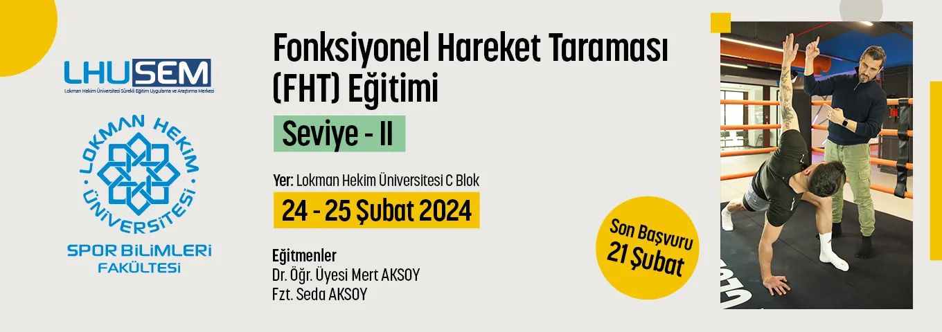 Lokman Hekim Üniversitesi Sürekli Eğitim Merkezi (LHUSEM) ve Spor Bilimleri Fakültesi iş birliği ile 24-25 Şubat 2024 tarihlerinde yüz yüze Fonksiyonel Hareket Taraması (FHT) Seviye II Eğitim Programı gerçekleştirilecektir.
