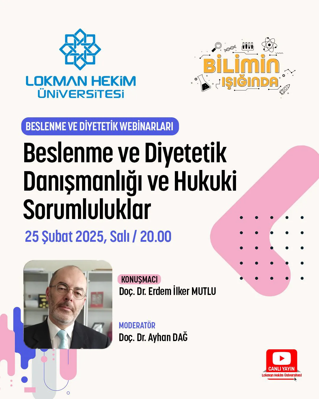 Lokman Hekim Üniversitesi, Sağlık Bilimleri Fakültesi, Beslenme ve Diyetetik Bölümünün düzenlediği "Beslenme ve Diyetetik Danışmanlığı ve Hukuki Sorumluluklar" isimli etkinlik ile sizlerle buluşuyor.