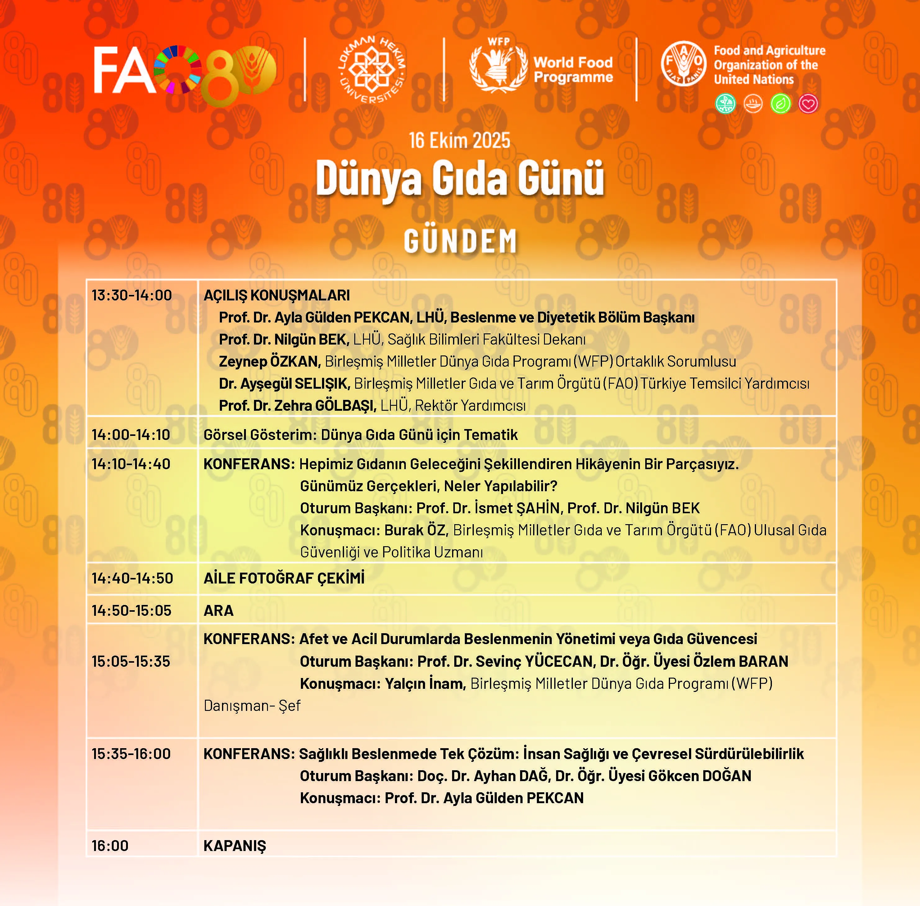 Lokman Hekim Üniversitesi Sağlık Bilimleri Fakültesi Beslenme ve Diyetetik Bölümü, 16 Ekim Dünya Gıda Günü kapsamında anlamlı bir etkinliğe ev sahipliği yapıyor. Birleşmiş Milletler Gıda ve Tarım Örgütü (FAO) ve Dünya Gıda Programı (WFP) iş birliğiyle düzenlenen bu özel etkinlik, kuruluşunun 80. yılında “Daha İyi Gıda ve Daha İyi Bir Gelecek İçin El Ele” temasıyla gerçekleştirilecek.