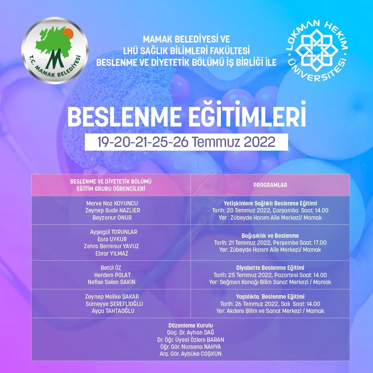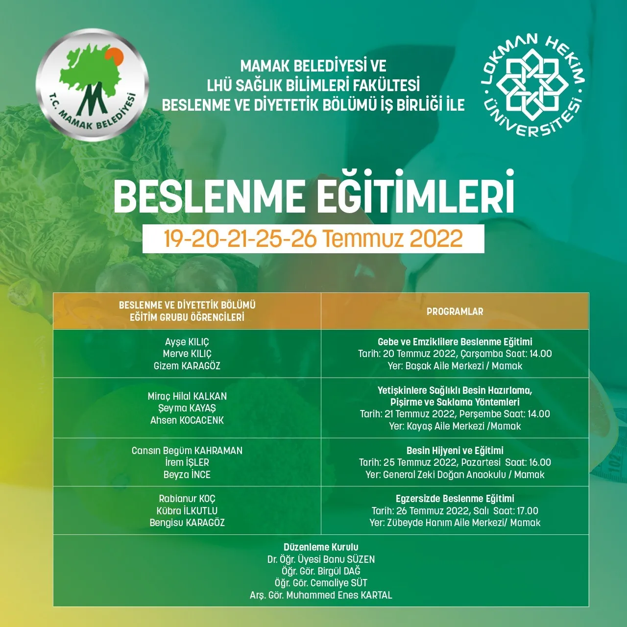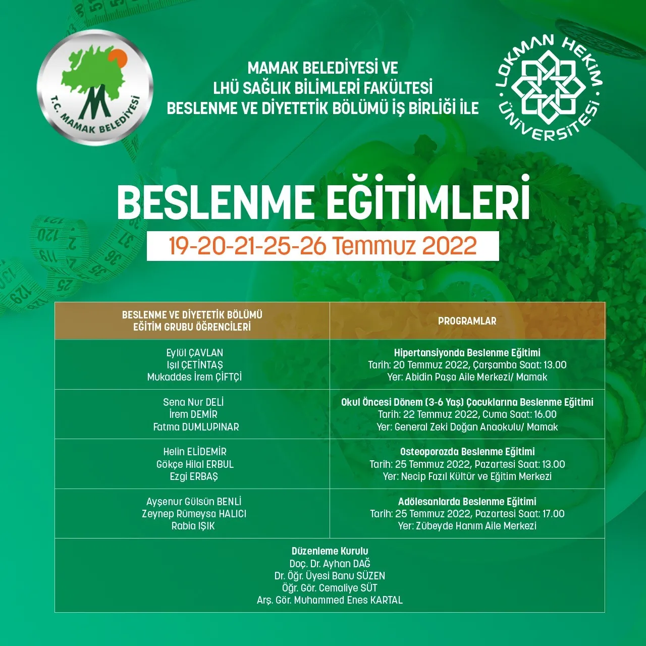 Sağlık Bilimleri Fakültesi etkinlikleri devam ediyor. Mamak Belediyesi ve Lokman Hekim Üniversitesi Sağlık Bilimleri Fakültesi Beslenme ve Diyetetik Bölümü iş birliği ile düzenlenen “Beslenme Eğitimleri” programı 19-20-21-25-26 Temmuz 2022 tarihlerinde gerçekleştirilecektir. Katılımlarınızı bekliyoruz.