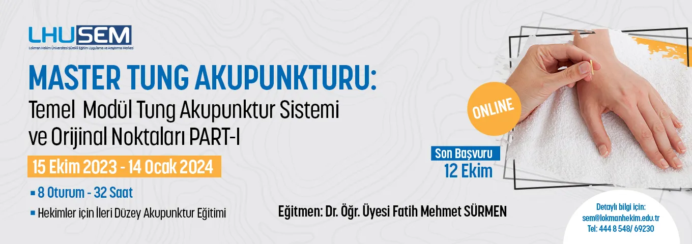 Lokman Hekim Üniversitesi Sürekli Eğitim Merkezi (LHUSEM) bünyesinde düzenlenecek olan “Master Tung Akupunkturu: Temel Modül- Tung Akupunktur Sistemi ve Orijinal Noktaları Part-I” 15 Ekim 2023/ 14 Ocak 2024 tarihleri arasında çevrimiçi olarak gerçekleştirilecektir.