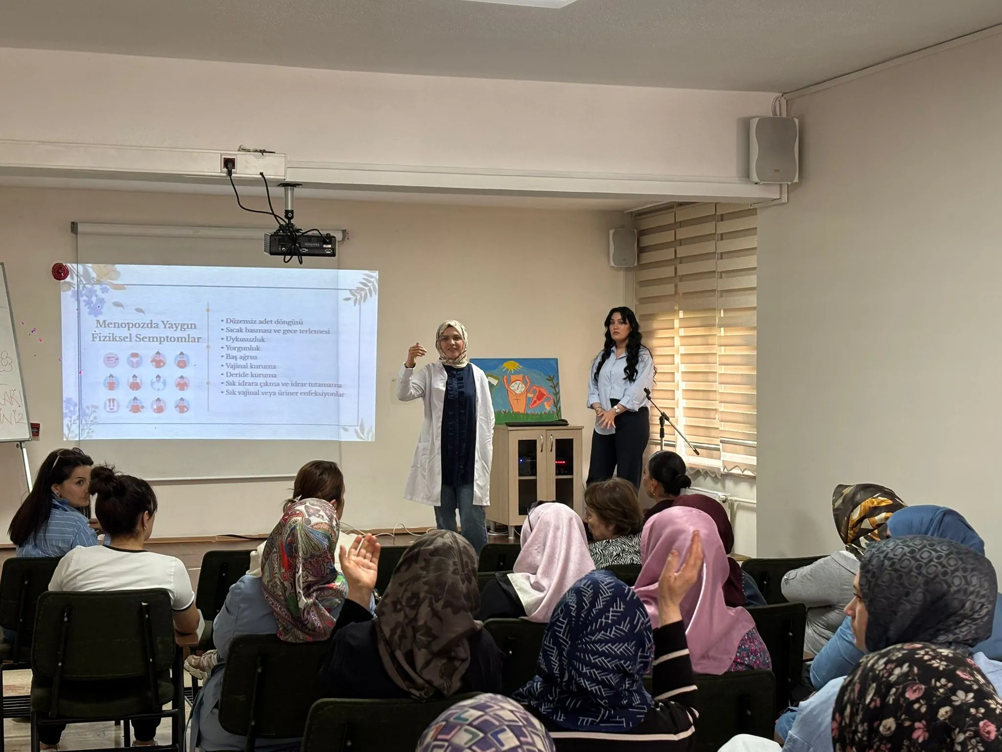 Kadınların yoğun katılım gösterdiği etkinlikte; menopoz dönemine özgü belirtiler, yaşlılıkla birlikte gelişen sağlık sorunları, duygusal değişimler ve baş etme yöntemleri interaktif bir sunumla ele alındı. Katılımcılar, yaşam kalitesini artırmaya yönelik önerilerle bilgilendirildi.
