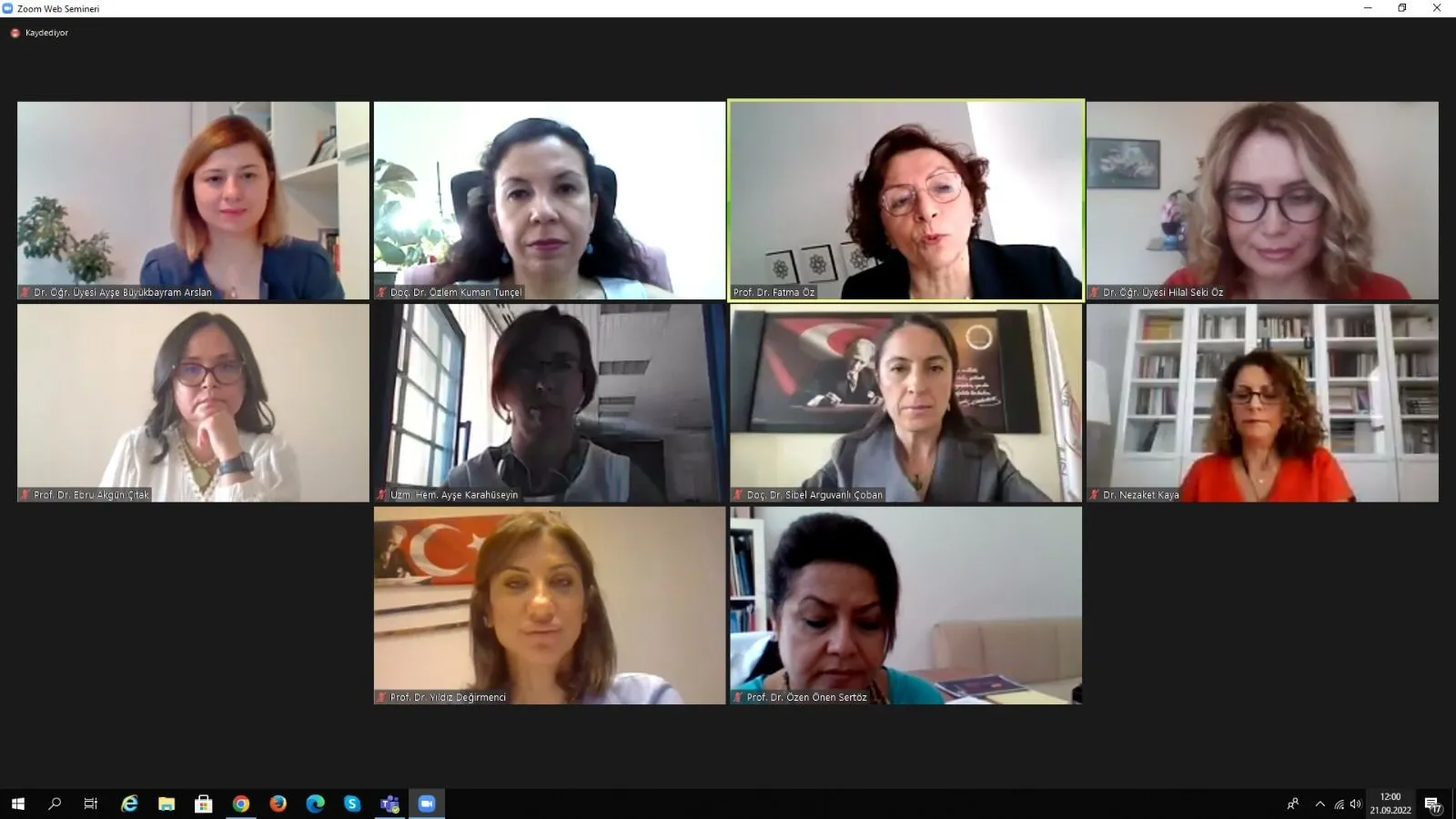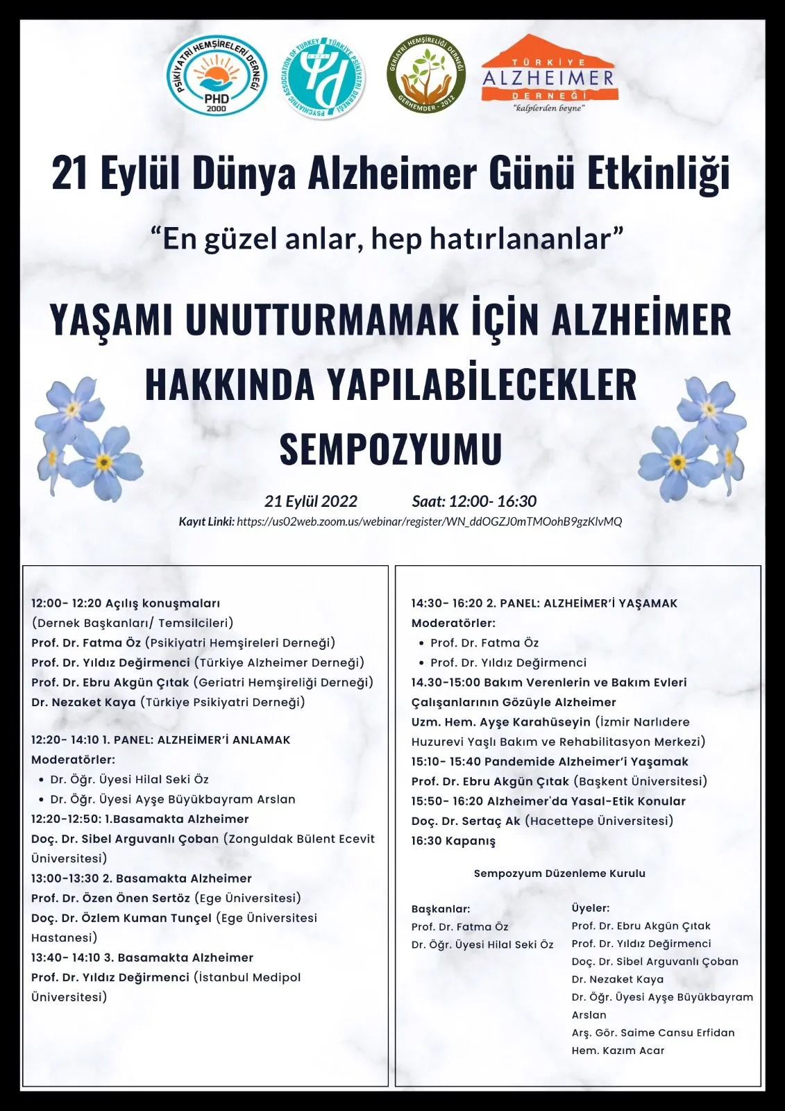 Sağlık Bilimleri Fakültesi Hemşirelik Bölümü Psikiyatri Hemşireliği Anabilim Dalı Başkanı Prof. Dr. Fatma ÖZ 21 Eylül 2022 tarihinde çevrimiçi düzenlenen 21 Eylül Dünya Alzheimer Günü Etkinliği ''Yaşamı Unutturmamak İçin Alzheimer Hakkında Yapılabilecekler Sempozyumu" na sempozyum başkanı ve moderatör olarak katılım sağladı.