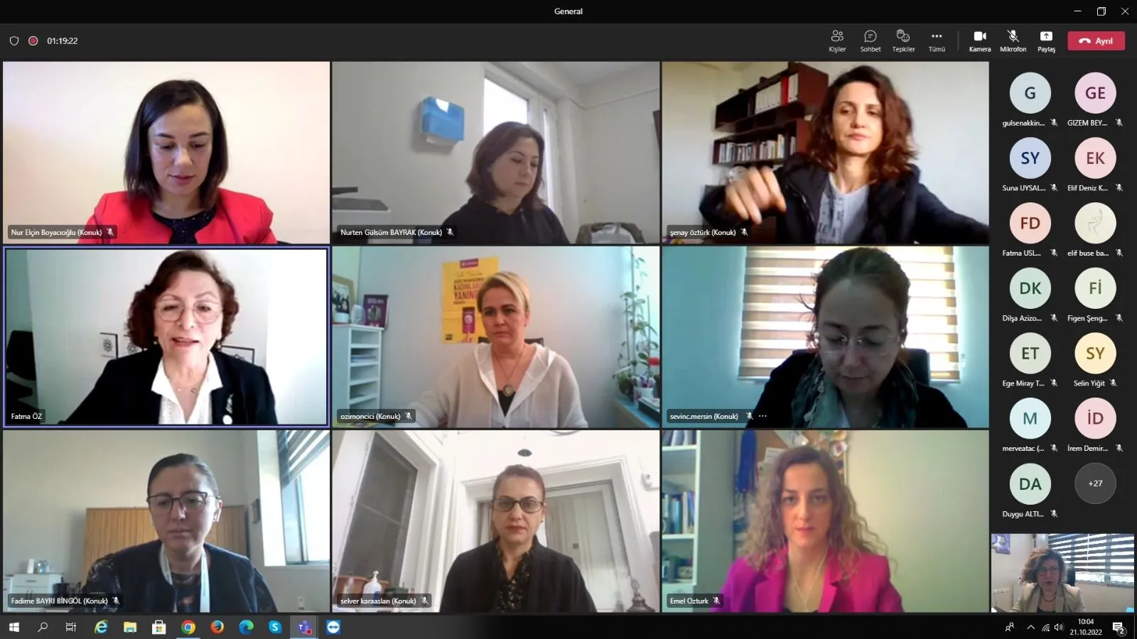 Sağlık Bilimleri Fakültesi Hemşirelik Bölümü Psikiyatri Hemşireliği Anabilim Dalı Başkanı Prof. Dr. Fatma ÖZ 21 Ekim 2022 tarihinde birincisi düzenlenen, ''Sorumluluk Al, Güçlü Kal, Şiddeti Önle" konulu Kadın Ruh Sağlığı Çalıştayı na çalıştay başkanı ve moderatör olarak katılım sağladı.