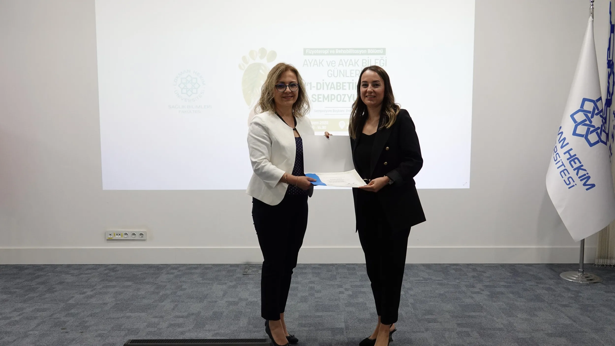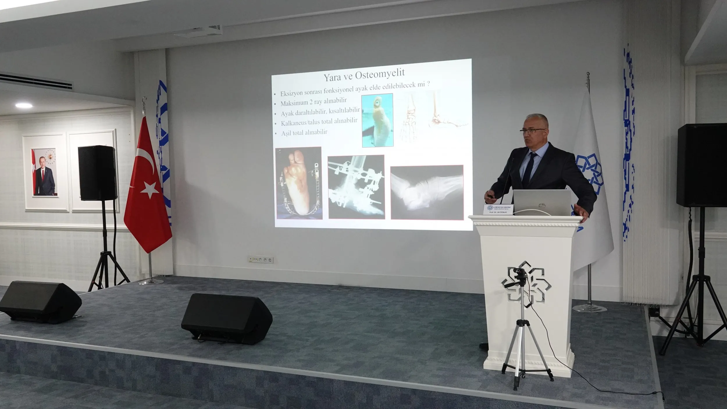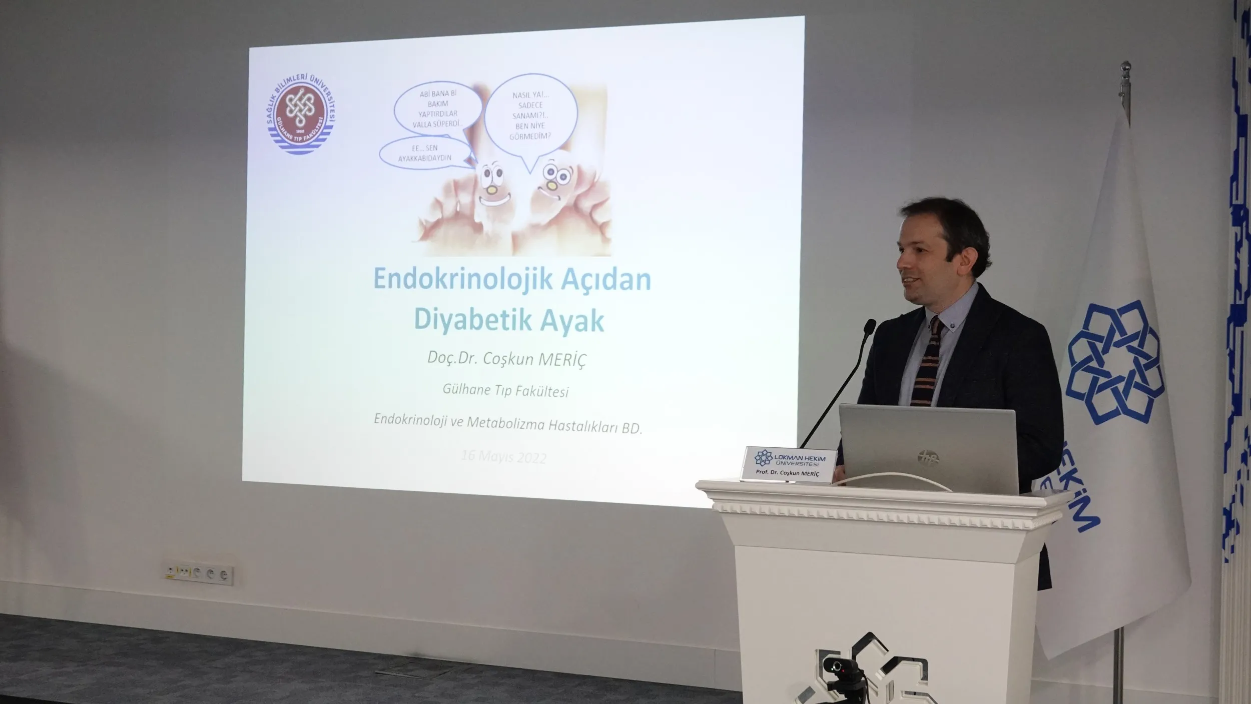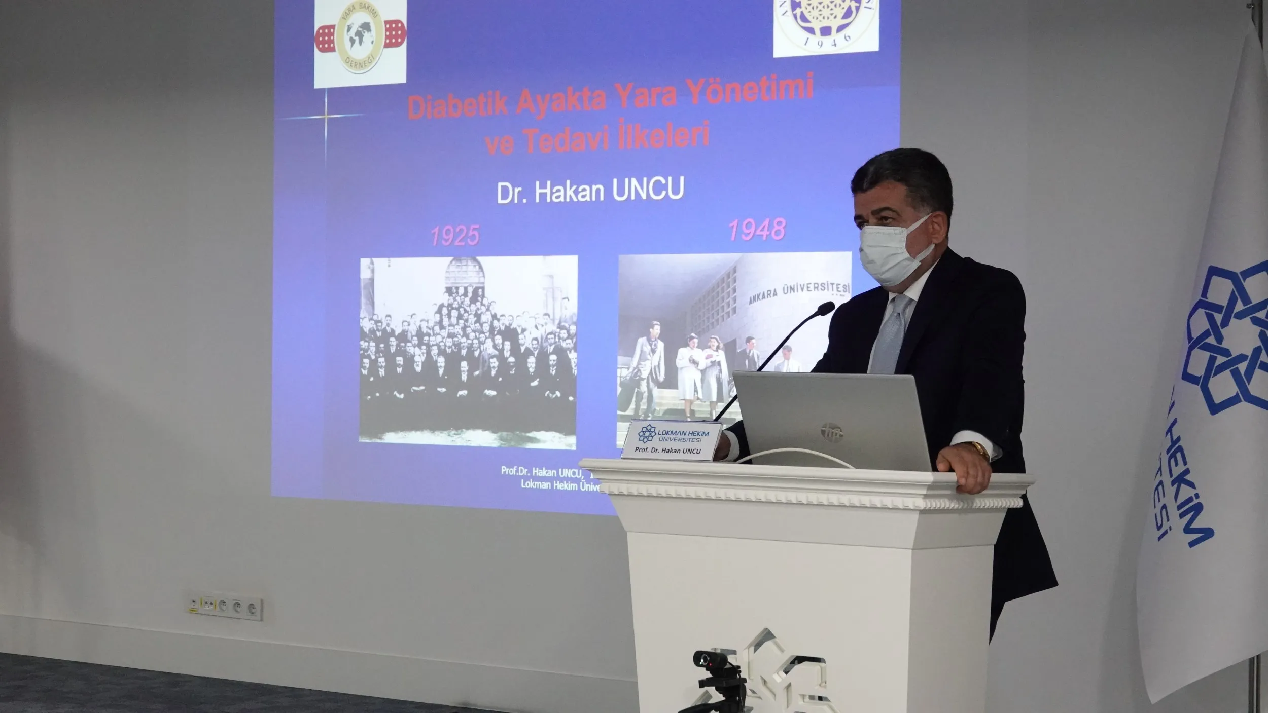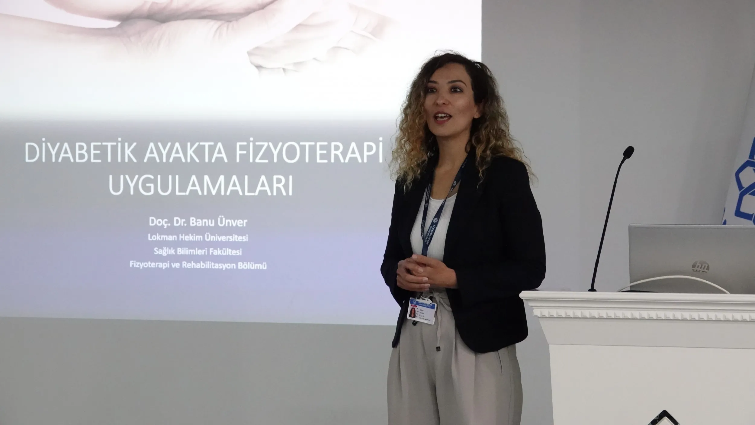 Lokman Hekim Üniversitesi Sağlık Bilimleri Fakültesi Fizyoterapi ve Rehabilitasyon Bölümü tarafından düzenlenen “Ayak ve Ayak Bileği Günleri” etkinliklerinin ilki olan “Diyabetik Ayak Sempozyumu” 16 Mayıs 2022 tarihinde Lokman Hekim Üniversitesi Konferans Salonunda gerçekleştirildi. Sempozyum, fizyoterapistler, hekimler, hemşireler ve podologlar ile öğrencilerden oluşan 132 katılımcı ile tamamlandı. Sempozyumda, diyabetik ayak konusu multidisipliner olarak tıbbi açıdan, fizyoterapi açısından ve uygulama örneği üzerinden ele alındı. Birinci paneli oluşturan “Tıbbi Açıdan Diyabetik Ayak” oturumu, Prof. Dr. Nilgün BEK’in moderatörlüğünde, Doç. Dr. Coşkun MERİÇ, Prof. Dr. Hakan UNCU ve Prof. Dr. Ali ÖZNUR’un katılımları ile yürütüldü. Endokrinoloji ve metabolizma hastalıkları uzmanı Doç. Dr. Coşkun MERİÇ “Endokrinolojik Açıdan Diyabetik Ayak”, genel cerrahi ve damar cerrahisi uzmanı Prof. Dr. Hakan UNCU “Diyabetik Ayakta Yara Yönetimi ve Tedavi İlkeleri” ve Ortopedi ve Travmatoloji Uzmanı Prof. Dr. Ali ÖZNUR “Diyabetik Ayak Cerrahileri” başlıklarında sunumlarını gerçekleştirdiler. “Fizyoterapi Açısından Diyabetik Ayak” başlığındaki ikinci panel Prof. Dr. Ayşe KARADUMAN’ın moderatörlüğünde gerçekleştirildi ve panelde Doç. Dr. Banu ÜNVER “Diyabetik Ayakta Fizyoterapi Uygulamaları”, Prof. Dr. Nilgün Bek “Diyabetik Ayakta Ortez-Ayakkabı Uygulamaları” başlığında konuşmalarını yaptı Son oturumda, uygulama örneği olarak ortopedik ürünler üretimi konusunda dünyaca ünlü Ottobock firmasının Türkiye’de diyabet hastaları ile yürüttüğü diyabetik ayakta koruyucu yaklaşım modeli Ottobock Türkiye ülke klinik program yöneticisi Fzt. Reyhan TUYGUN tarafından “Diyabetik Ayakta İyi Uygulama Modeli” başlığıyla anlatıldı. Sempozyum kapsamında “Bilim Ortez Protez AŞ” ve Ottobock Türkiye firmaları katılımcılara diyabetik ayak için kullandıkları ürünlerini stantlarında tanıttılar. https://www.youtube.com/watch?v=GsvNmP6Ku-s