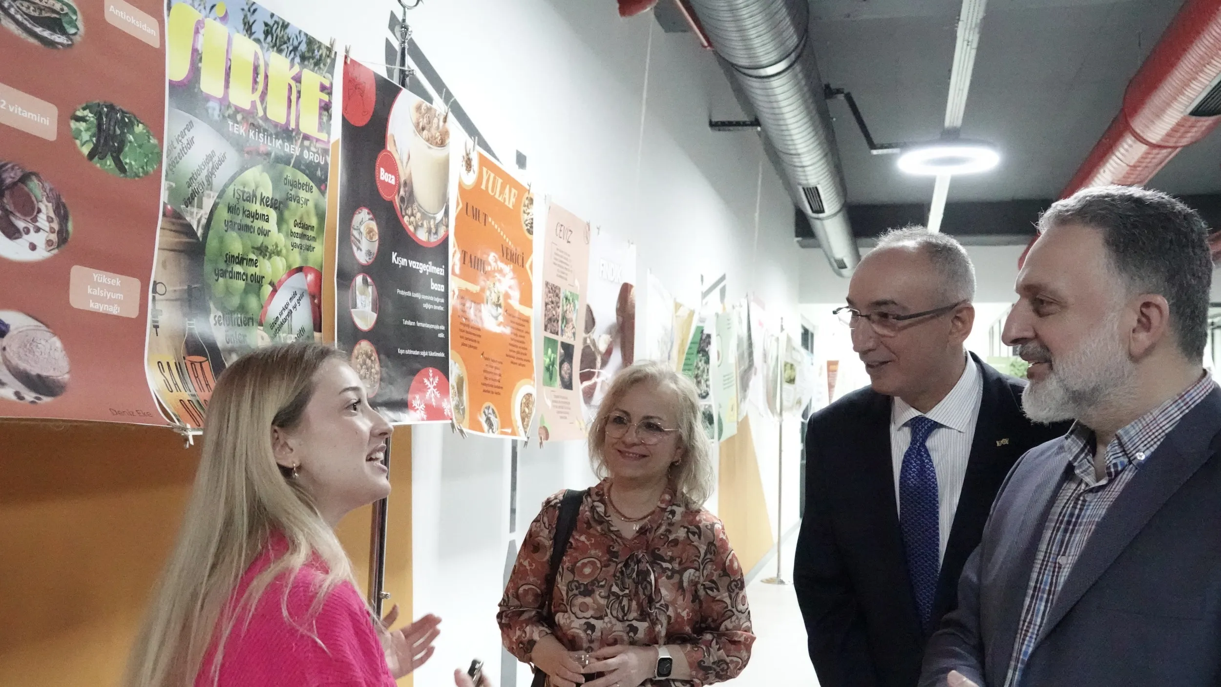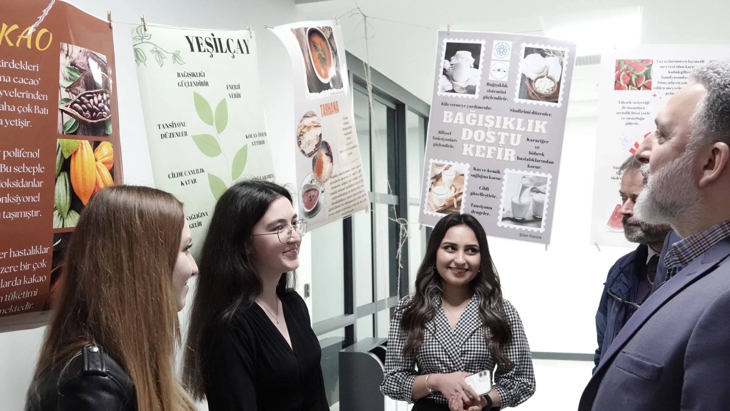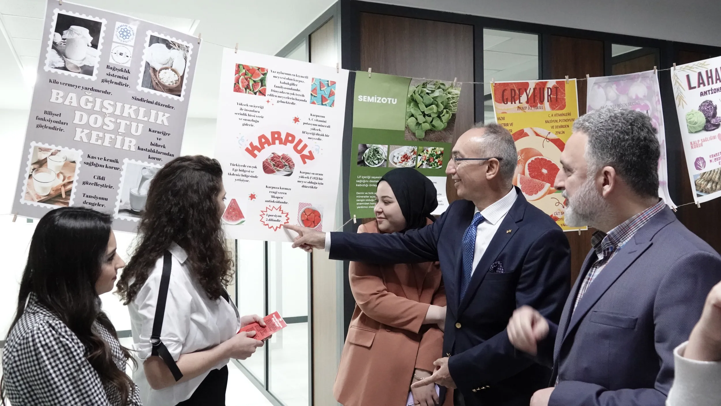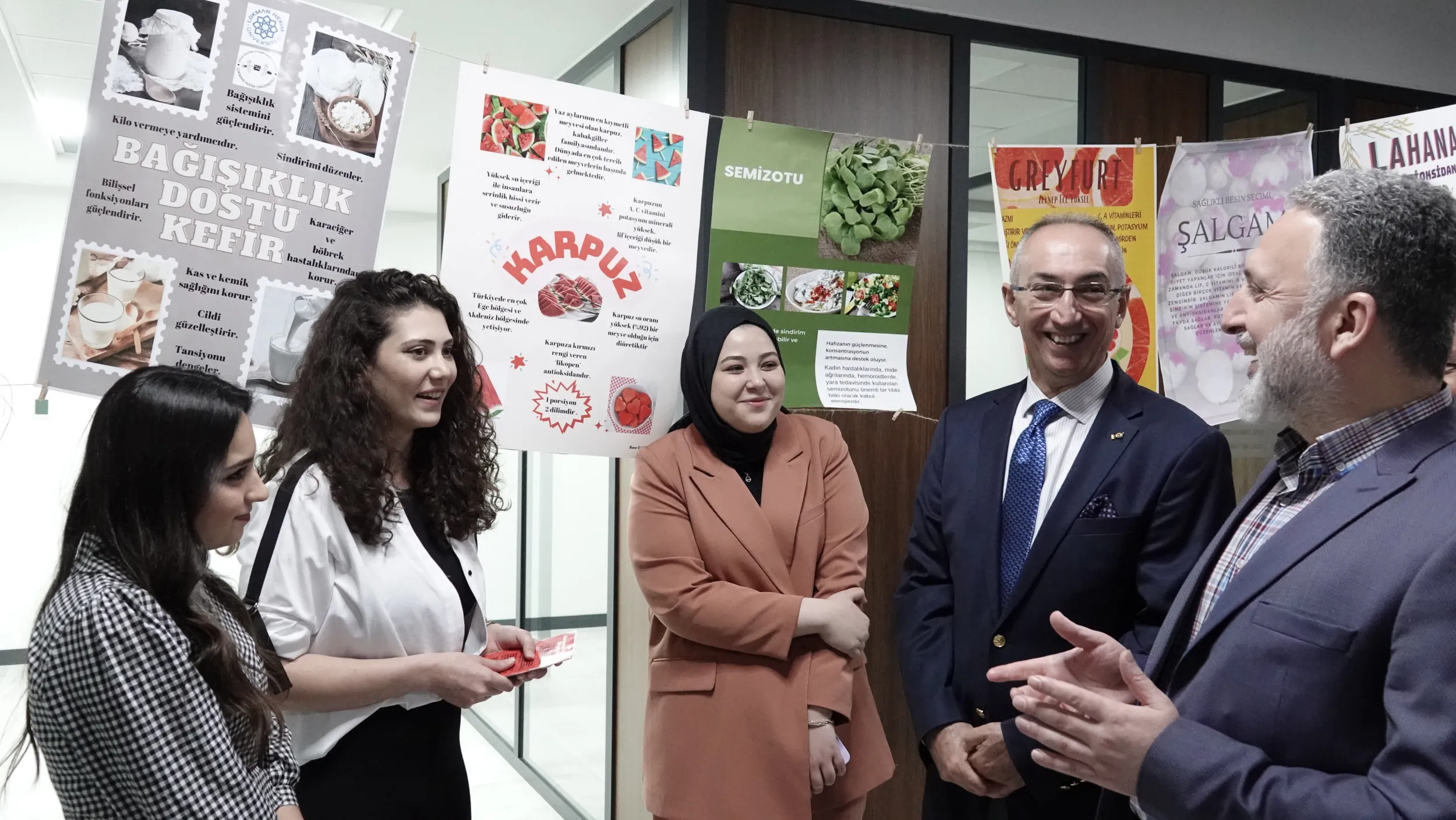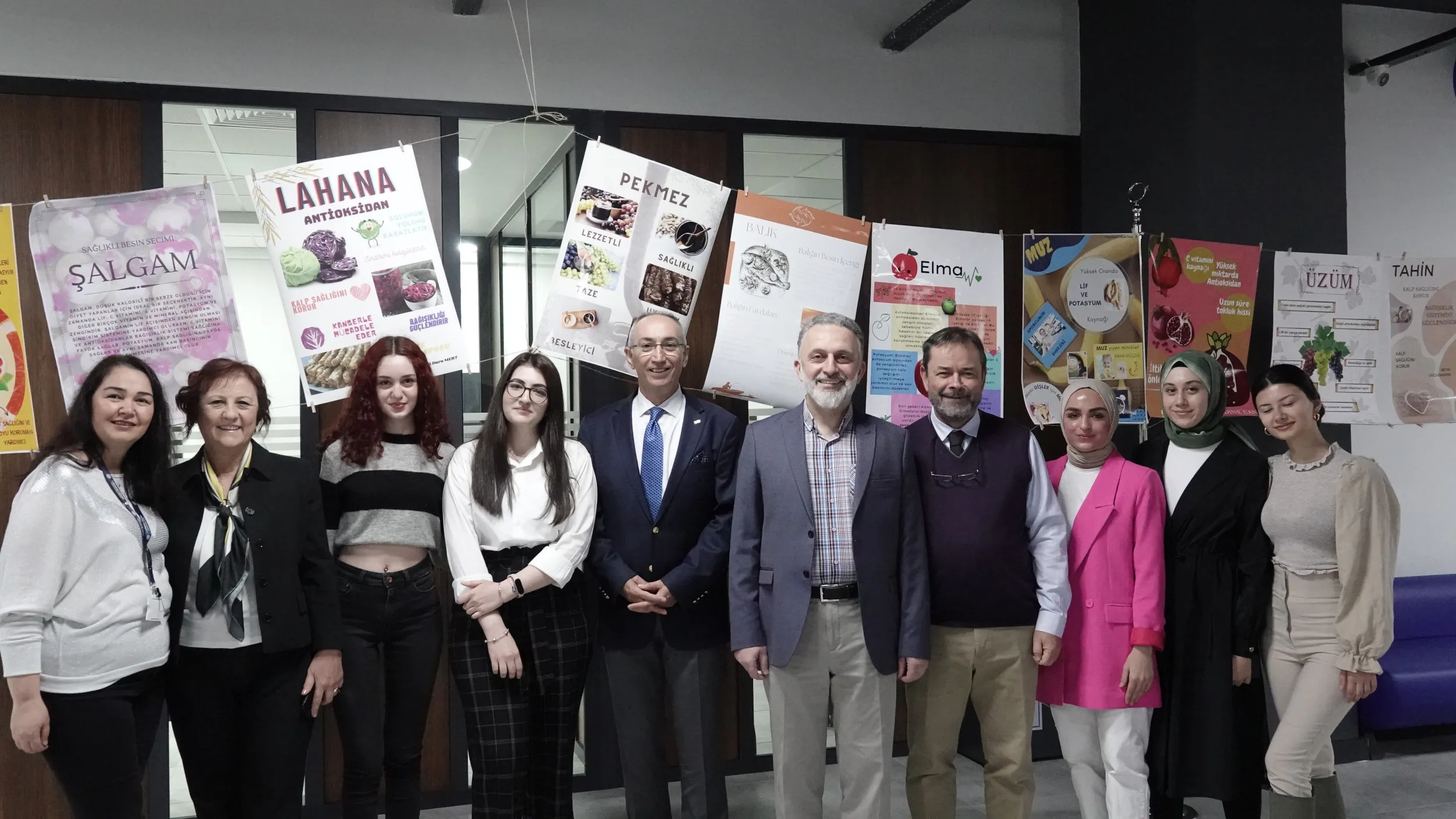 Mütevelli Heyet Başkanımız Dr. Mehmet ALTUĞ, Rektör Yardımcımız Prof. Dr. İsmet ŞAHİN, Sağlık Bilimleri Fakültesi Dekanı Prof. Dr. Nilgün BEK, Beslenme ve Diyetetik bölüm Başkanı Doç. Dr. Ayhan DAĞ, ders sorumlusu Öğr. Gör. Birgül DAĞ, beslenme ve diyetetik bölümü akademisyen ve öğrencilerinin katılımı ile gerçekleştirilen poster sergisinde 1. sınıf öğrencileri posterleri hakkında bilgi verdiler.