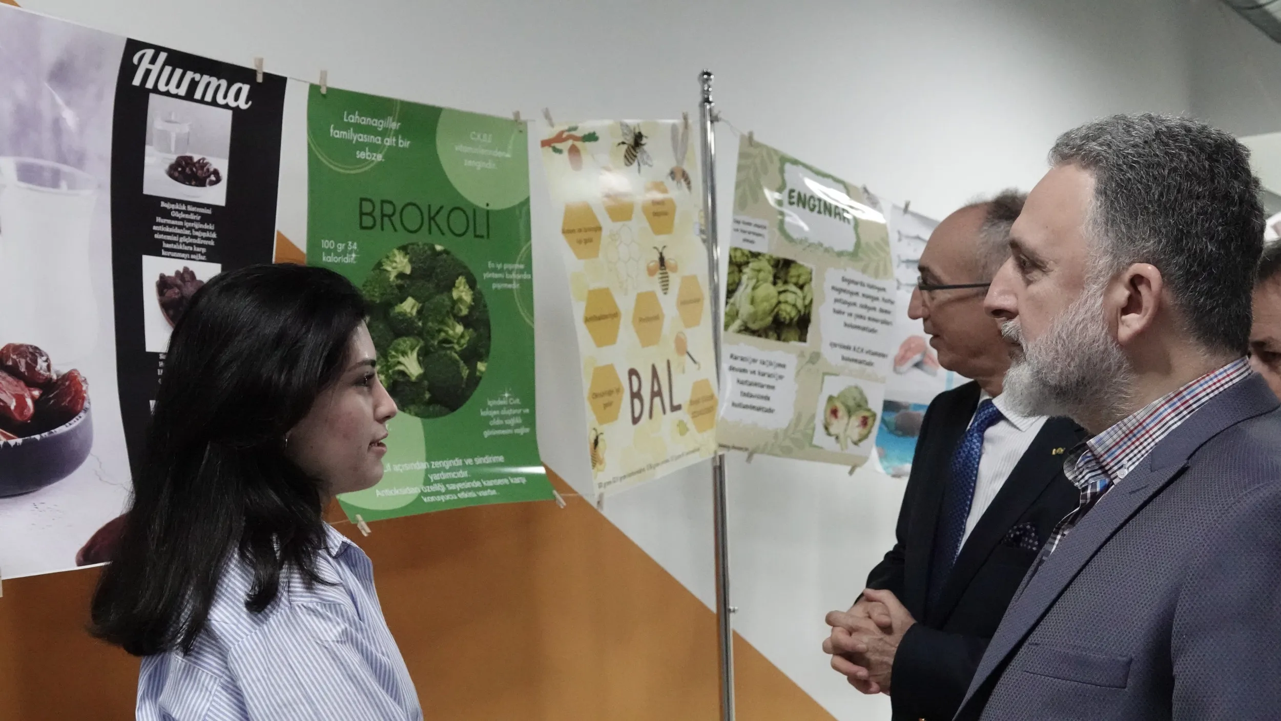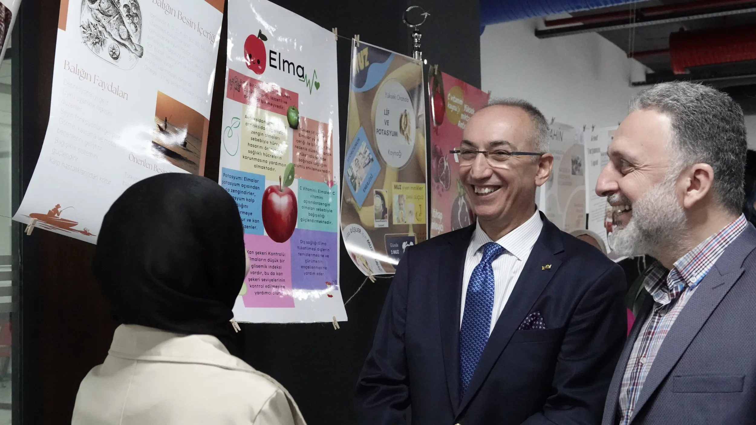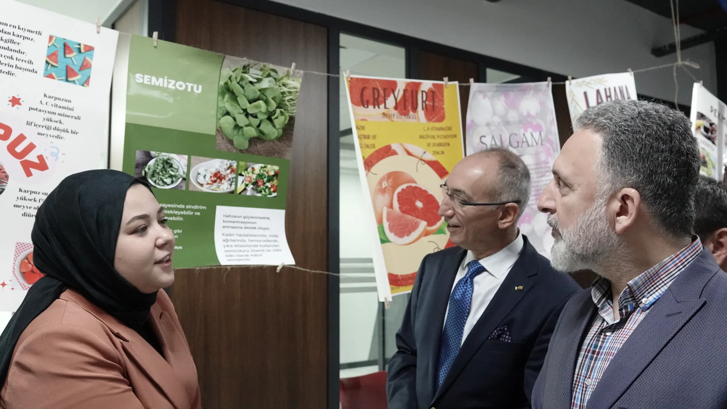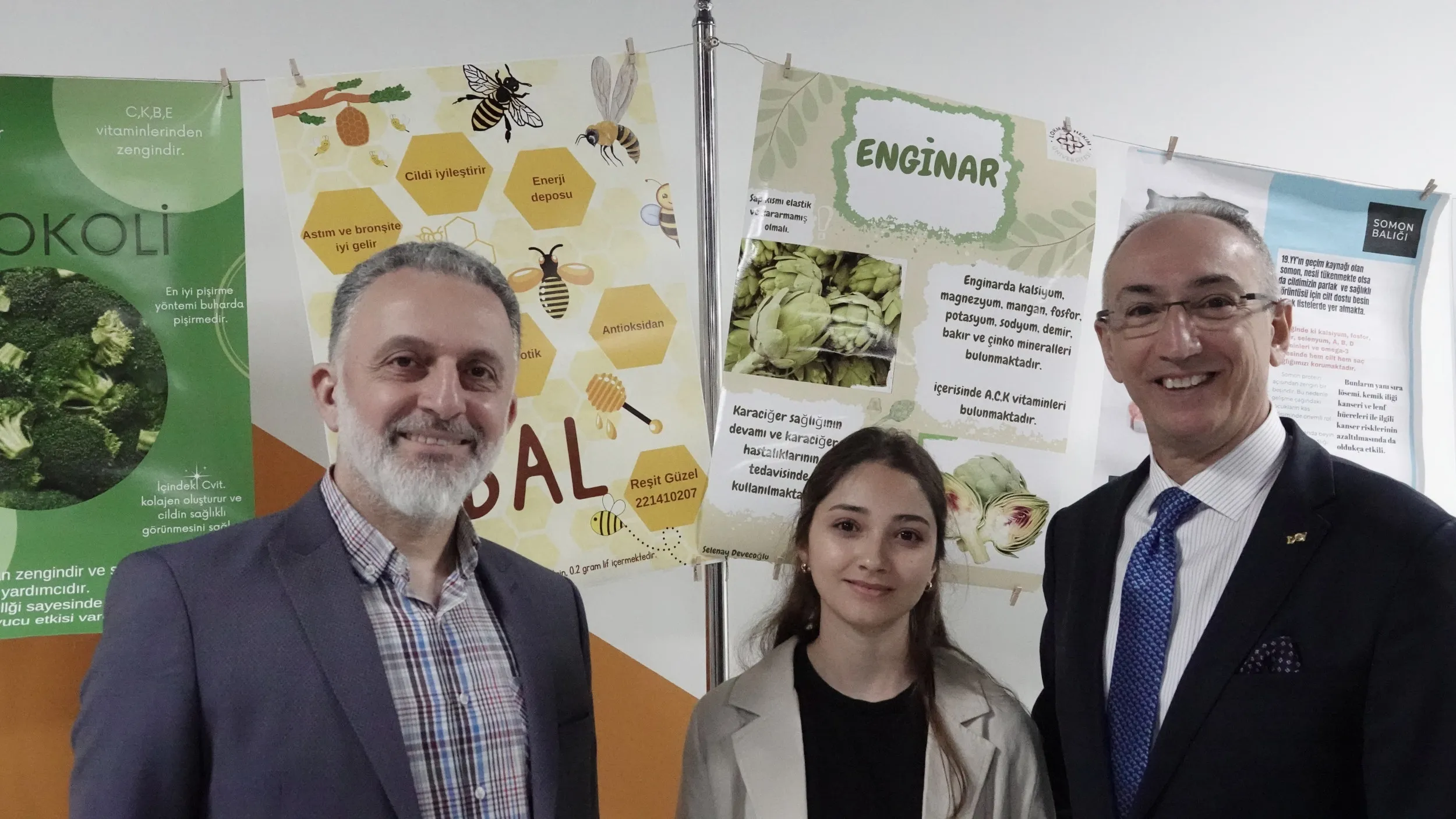Mütevelli Heyet Başkanımız Dr. Mehmet ALTUĞ, Rektör Yardımcımız Prof. Dr. İsmet ŞAHİN, Sağlık Bilimleri Fakültesi Dekanı Prof. Dr. Nilgün BEK, Beslenme ve Diyetetik bölüm Başkanı Doç. Dr. Ayhan DAĞ, ders sorumlusu Öğr. Gör. Birgül DAĞ, beslenme ve diyetetik bölümü akademisyen ve öğrencilerinin katılımı ile gerçekleştirilen poster sergisinde 1. sınıf öğrencileri posterleri hakkında bilgi verdiler.