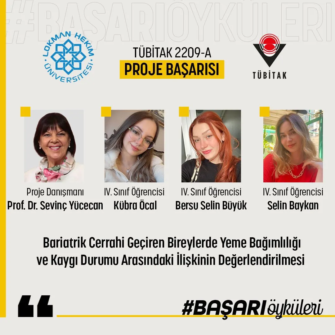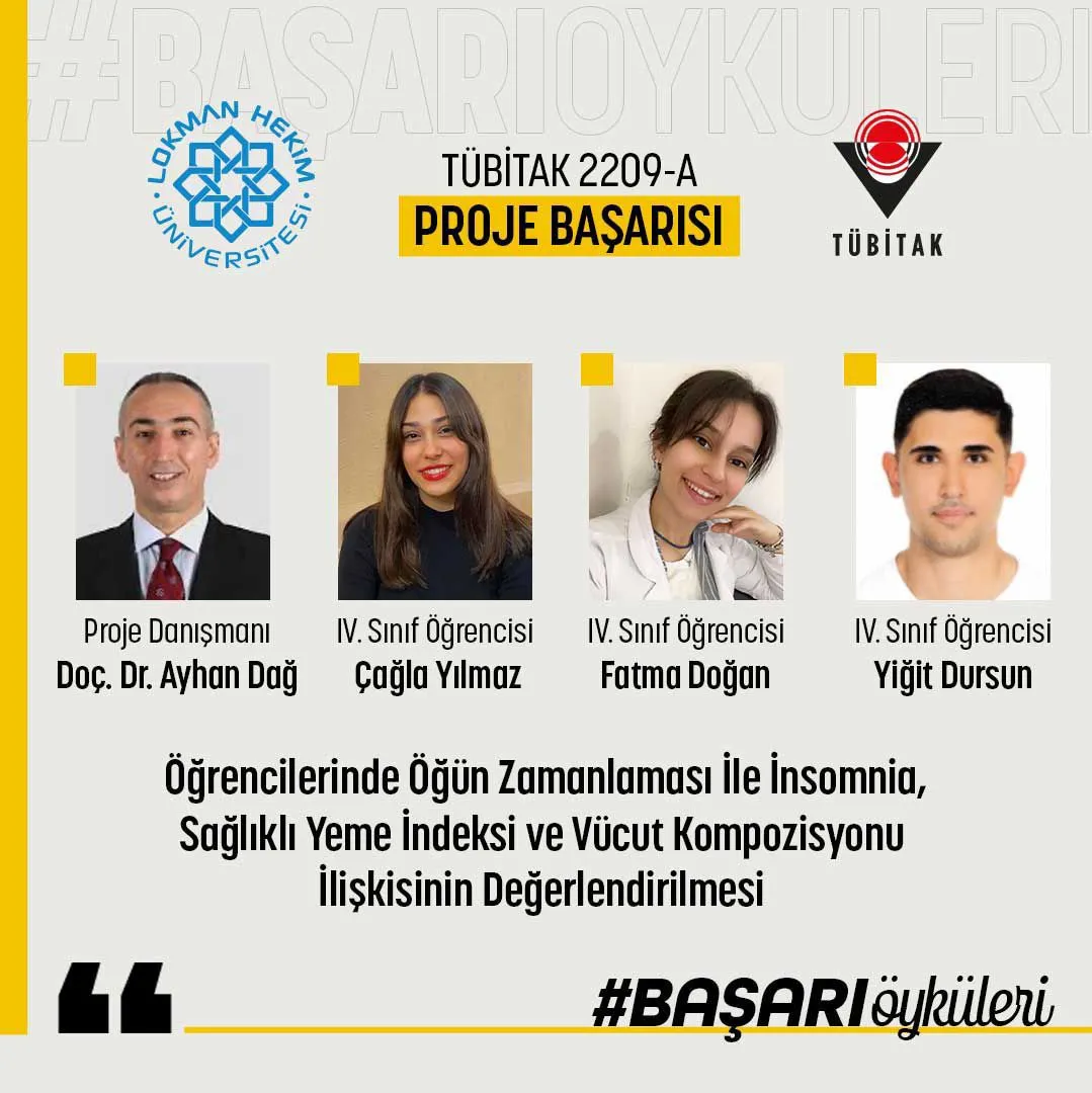 Üniversitemiz Sağlık Bilimleri Fakültesi Beslenme ve Diyetetik Bölüm Başkanı Doç. Dr. Ayhan Dağ’ın yürütücüsü olduğu ve Beslenme ve Diyetetik Bölümü 4. sınıf öğrencilerimiz Çağla Yılmaz, Fatma Doğan, ve Yiğit Dursun tarafından geliştirilen “Öğrencilerinde Öğün Zamanlaması İle İnsomnia, Sağlıklı Yeme İndeksi ve Vücut Kompozisyonu İlişkisinin Değerlendirilmesi” başlıklı araştırma projesi ve Üniversitemiz Sağlık Bilimleri Fakültesi Beslenme ve Diyetetik Bölümü Prof. Dr. Sevinç Yücecan’ın yürütücüsü olduğu ve Beslenme ve Diyetetik Bölümü 4. sınıf öğrencilerimiz Kübra Öcal, Bersu Selin Büyük, Selin Baykan tarafından geliştirilen “Bariatrik Cerrahi Geçiren Bireylerde Yeme Bağımlılığı ve Kaygı Durum Arasındaki İlişkinin Değerlendirilmesi” başlıklı araştırma projesi TÜBİTAK 2209-A kapsamında desteklenmeye değer bulunmuştur. Hocamızı ve öğrencilerimizi kutlar başarılarının devamını dileriz.