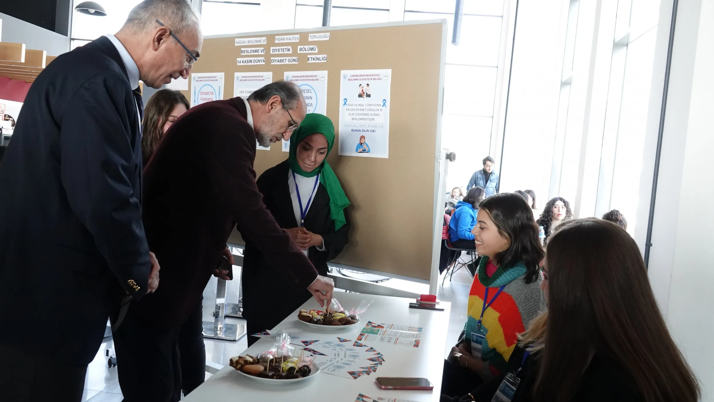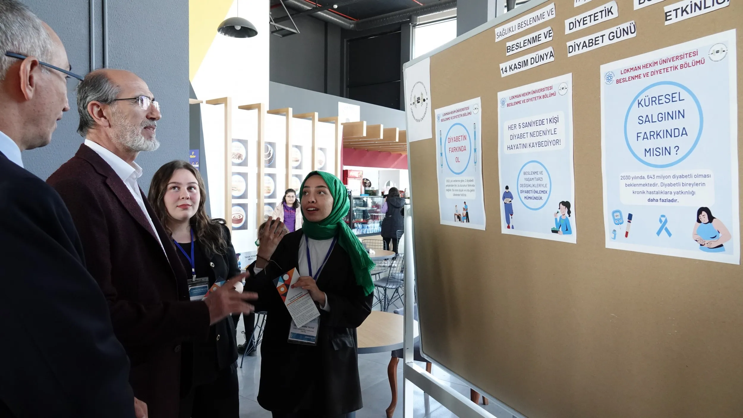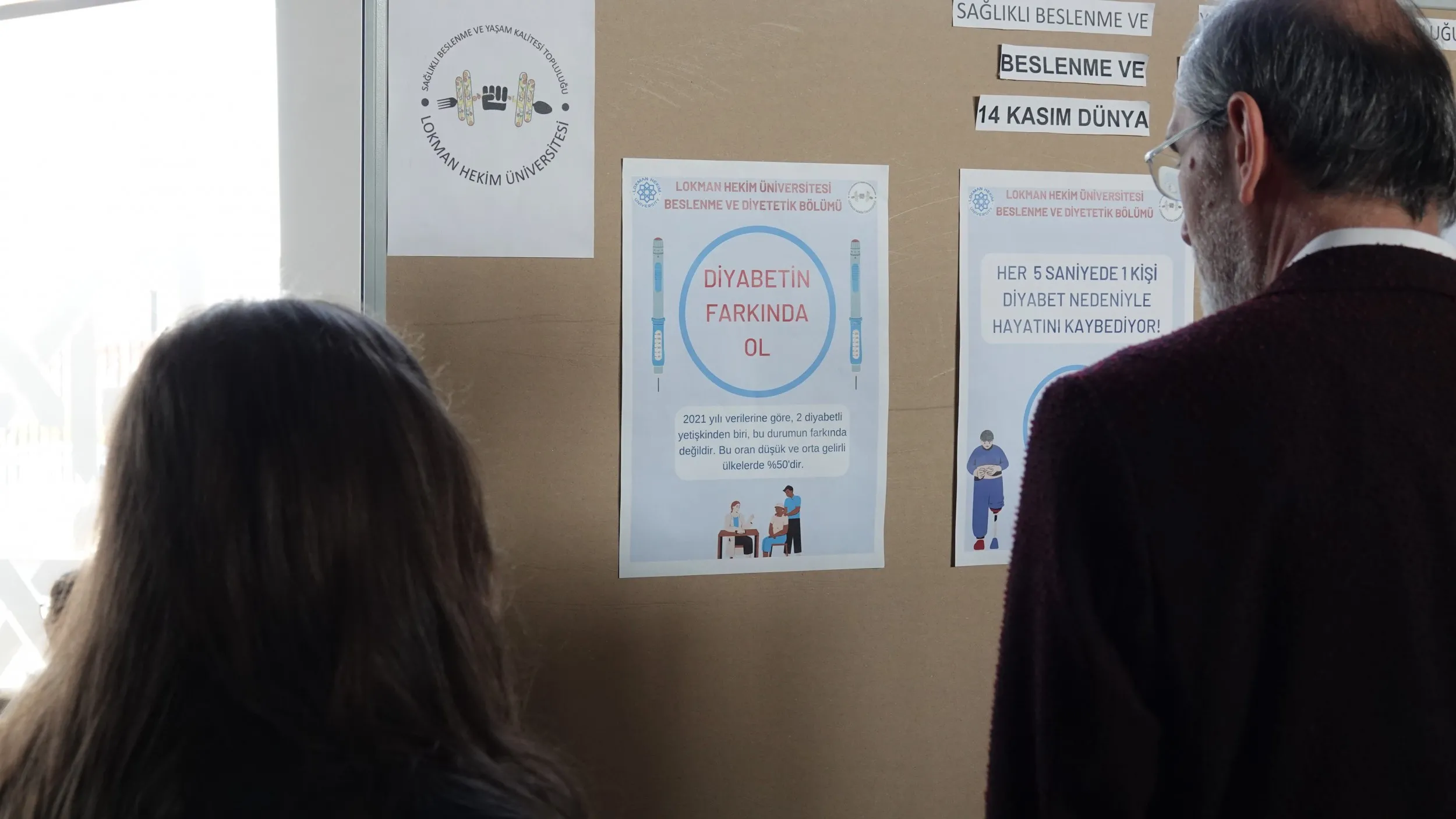 Lokman Hekim Üniversitesi Sağlık Bilimleri Fakültesi Beslenme ve Diyetetik Bölümü Etkinlikleri Devam Ediyor. Sağlık Bilimleri Fakültesi Beslenme ve Diyetetik Bölümü ve Sağlıklı Beslenme ve Yaşam Topluluğu iş birliği ile 14 Kasım Dünya Diyabet Gününde üniversitemiz A Blok fuaye alanında Dünya Diyabet Günü Farkındalık etkinliği düzenlendi. Beslenme ve Diyetetik Bölümü akademisyen ve öğrencilerinin katılımı ile düzenlenen etkinlikte diyabet farkındalığı için afiş, broşür ve beslenme ilkeleri laboratuvarında hazırlanan çeşitli kurabiye ve yiyecekler sergilendi. Rektörümüz Prof. Dr. Fatih GÜLTEKİN ve Beslenme ve Diyetetik Bölüm Başkanı Doç. Dr. Ayhan DAĞ, etkinlikte emeği geçen tüm akademisyen ve öğrencilerimize teşekkürlerini iletti.