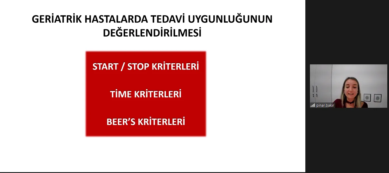 Lokman Hekim Üniversitesi Sürekli Eğitim Merkezi (LHUSEM) ve Eczacılık Fakültesi iş birliği ile düzenlenen “Farmasötik Bakım Serisi : Geriatrik Hastalarda Antikolinerjik İlaç Yükü ve Eczacının Rolü” başlıklı eğitim, 7 Aralık 2022 tarihinde çevrimiçi olarak Prof. Dr. Belma GÜMÜŞEL moderatörlüğünde Dr. Öğr. Üyesi Pınar BAKIR EKİNCİ’nin katılımı ile gerçekleştirildi.