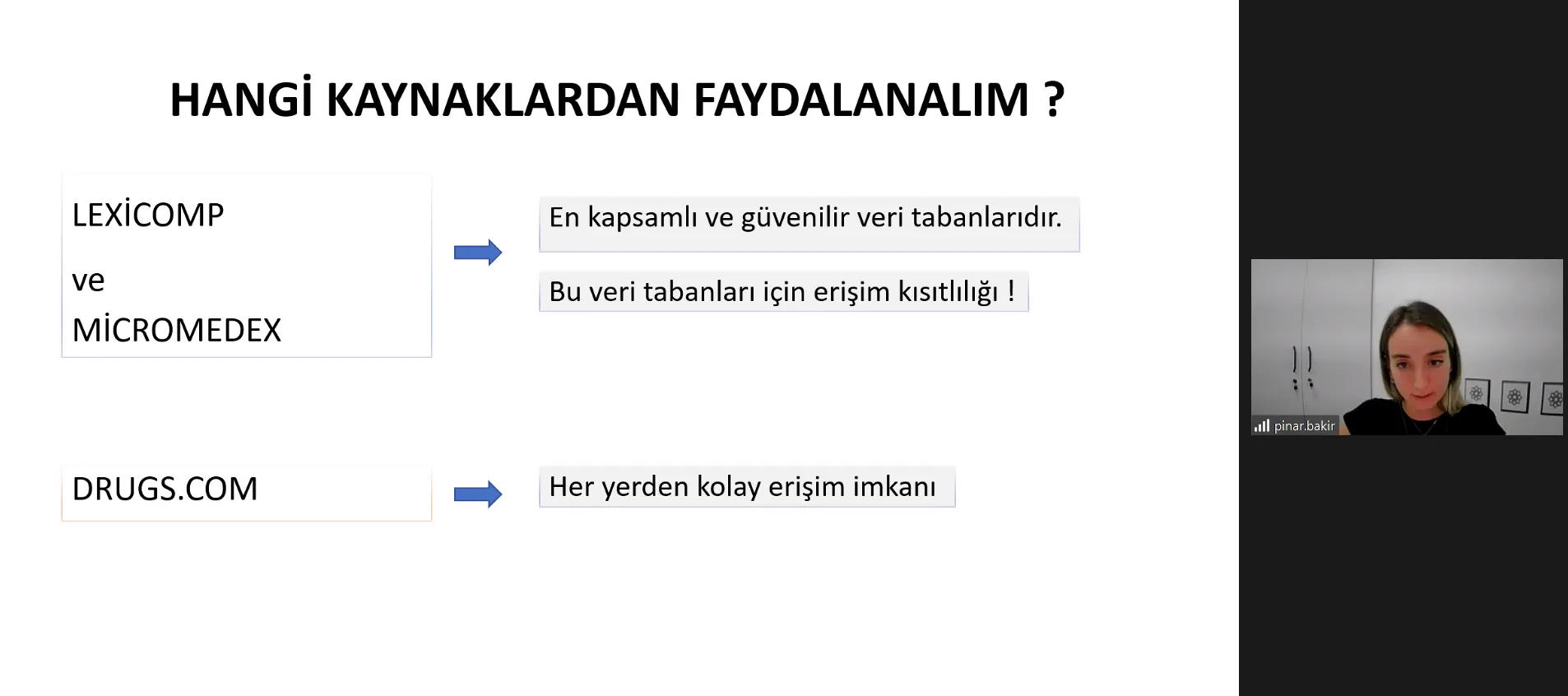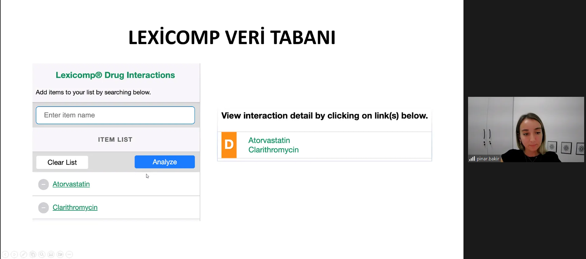 Lokman Hekim Üniversitesi Sürekli Eğitim Merkezi (LHUSEM) ve Eczacılık Fakültesi iş birliği ile düzenlenen “Farmasötik Bakım Serisi : Potansiyel İlaç-İlaç Etkileşimlerinin Tespit Edilmesinde Yararlanılan Kaynaklar ve İlaç-İlaç Etkileşimlerinin Yönetimi” başlıklı eğitim, 16 Kasım 2022 tarihinde çevrimiçi olarak Prof. Dr. Belma GÜMÜŞEL moderatörlüğünde Dr. Öğr. Üyesi Pınar BAKIR EKİNCİ’nin katılımı ile gerçekleştirildi.