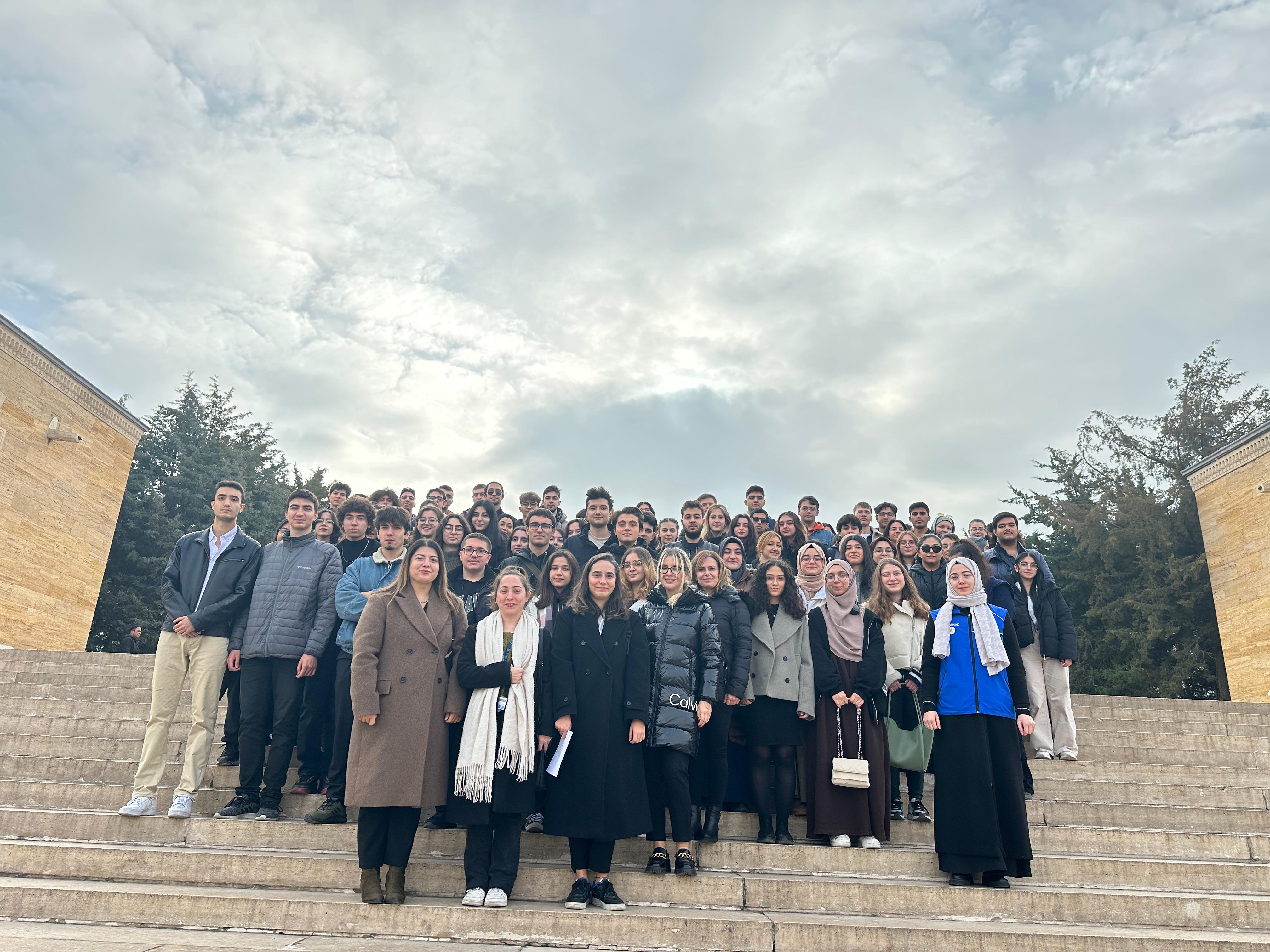 Geziye katılan öğrenciler ilk olarak Anıtkabir’in inşasının 9 yıllık serüveni, mimarisi ve sembolleri hakkında öğretim görevlileri tarafından bilgilendirildi. Aslanlı yolun hikâyesi, üç kadın ve üç erkek heykellerinin anlamı, mozoleye çıkan her bir basamağın değeri üzerine öğretim görevlilerimizle sohbet ederek tören meydanına ulaştılar. Cumhuriyetimizin kurucusu Gazi Mustafa Kemal Atatürk’e duyulan saygının bir ifadesi olarak saygı duruşunda bulunmasının ardından mozoleye çıkarak anıt mezarı ziyaret ettiler.