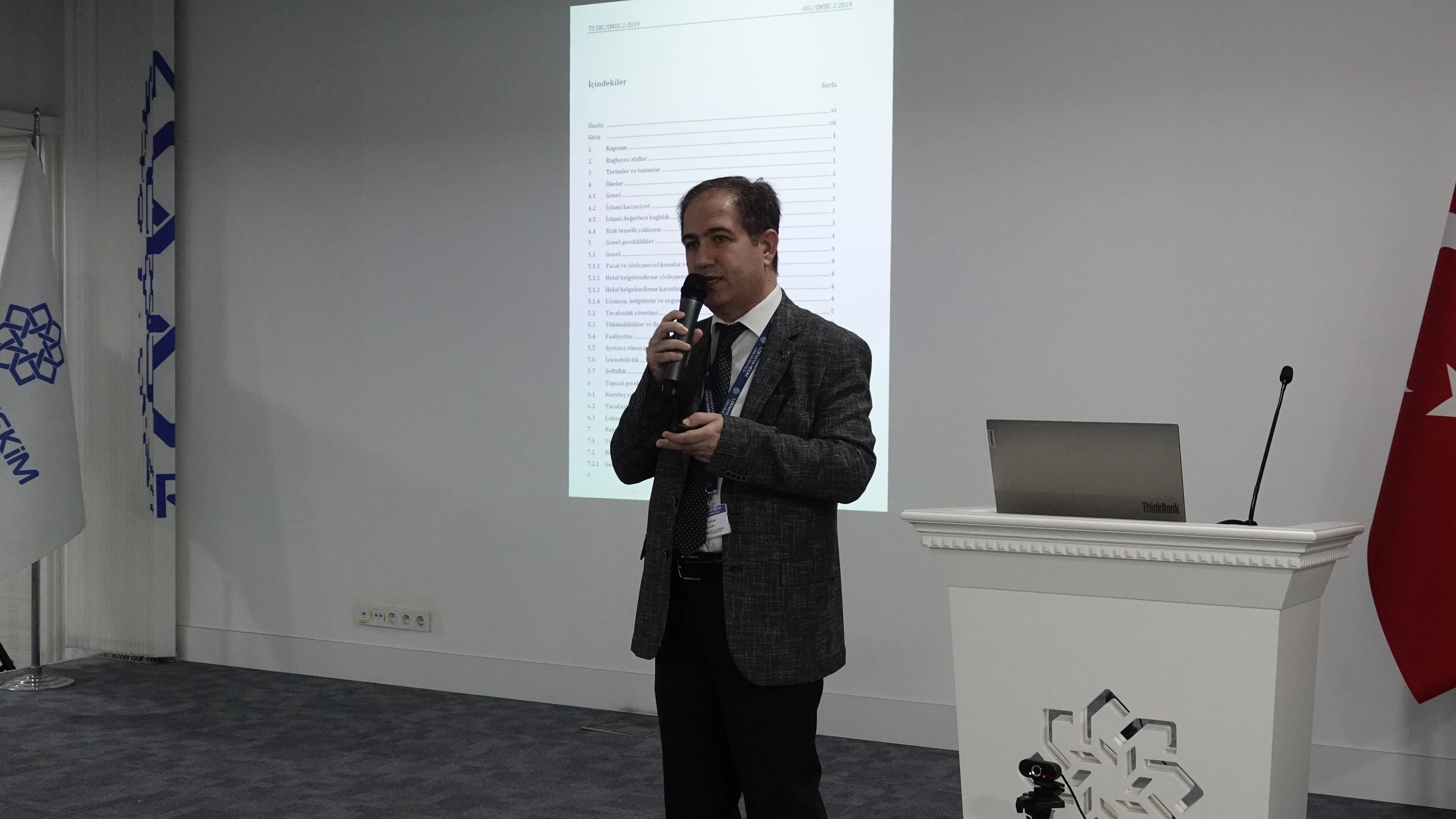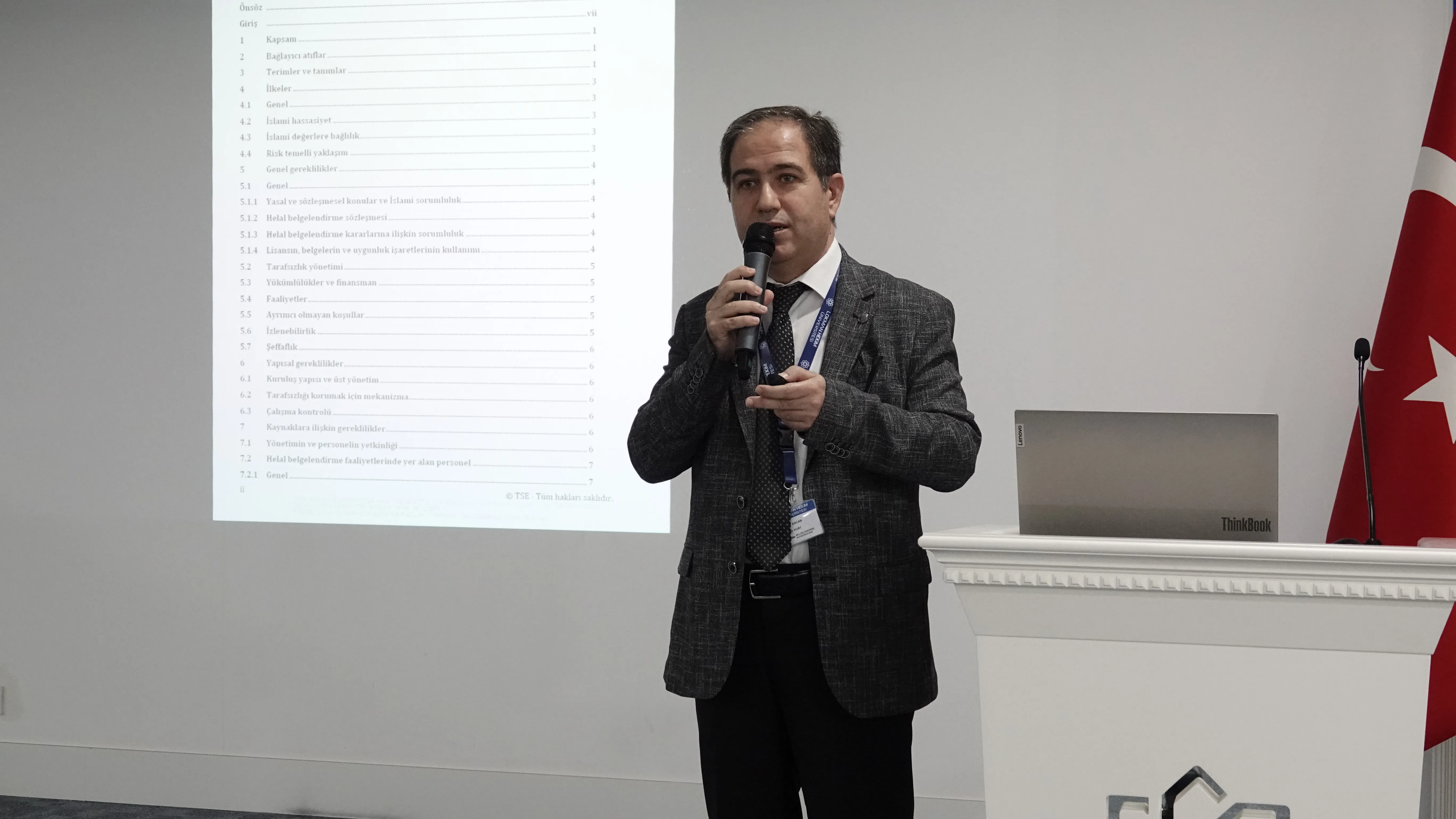 Gün boyunca süren toplantı programı, Merkez Sistem Sorumlusu Fatma Betül TELLİOĞLU’nun sunumu ile başladı. TELLİOĞLU, Üniversitemizin tanıtımıyla beraber Merkezimizin kuruluşu, faaliyetleri ve helal uygunluk değerlendirme altyapısı hakkında bilgiler verdi. Helal ve sağlıklı yaşam farkındalığını artırmak; bilimselliği ön planda tutarak helal ürün ve hizmetlerin dünya çapında yaygınlaştırılmasını sağlamak vizyonuna sahip olduğumuzu vurguladı. “Helal uygunluk değerlendirmeyi belgelendirmenin ötesinde bir kavram olarak görüyoruz. Altyapımızda İslami hassasiyet ve İslami değerlere bağlılık ile tarafsızlık, gizlilik ve operasyonel risklerin yönetimi ilkelerini benimsemekteyiz ve bu doğrultuda kurul ve komitelerimizi oluşturduk.” dedi. Program Belgelendirme Koordinatörü Ercan KURT’un helal uygunluk değerlendirme faaliyetinin aşamaları, uzman nitelikleri ve tetkiklerin nasıl yapılacağına dair açıklamaları ile devam etti. KURT yapmış olduğu sunumda Merkezimizin helal uygunluk değerlendirme faaliyetleri kapsamında oluşturulmuş dokümantasyon yapısını, uzman havuzuna alınma şartlarını, uzmanların sahadaki davranışlarında dikkat edilmesi gereken konuları ve raporlama teknikleri ile tetkik sonrası işlemleri detaylı bir şekilde aktardı.