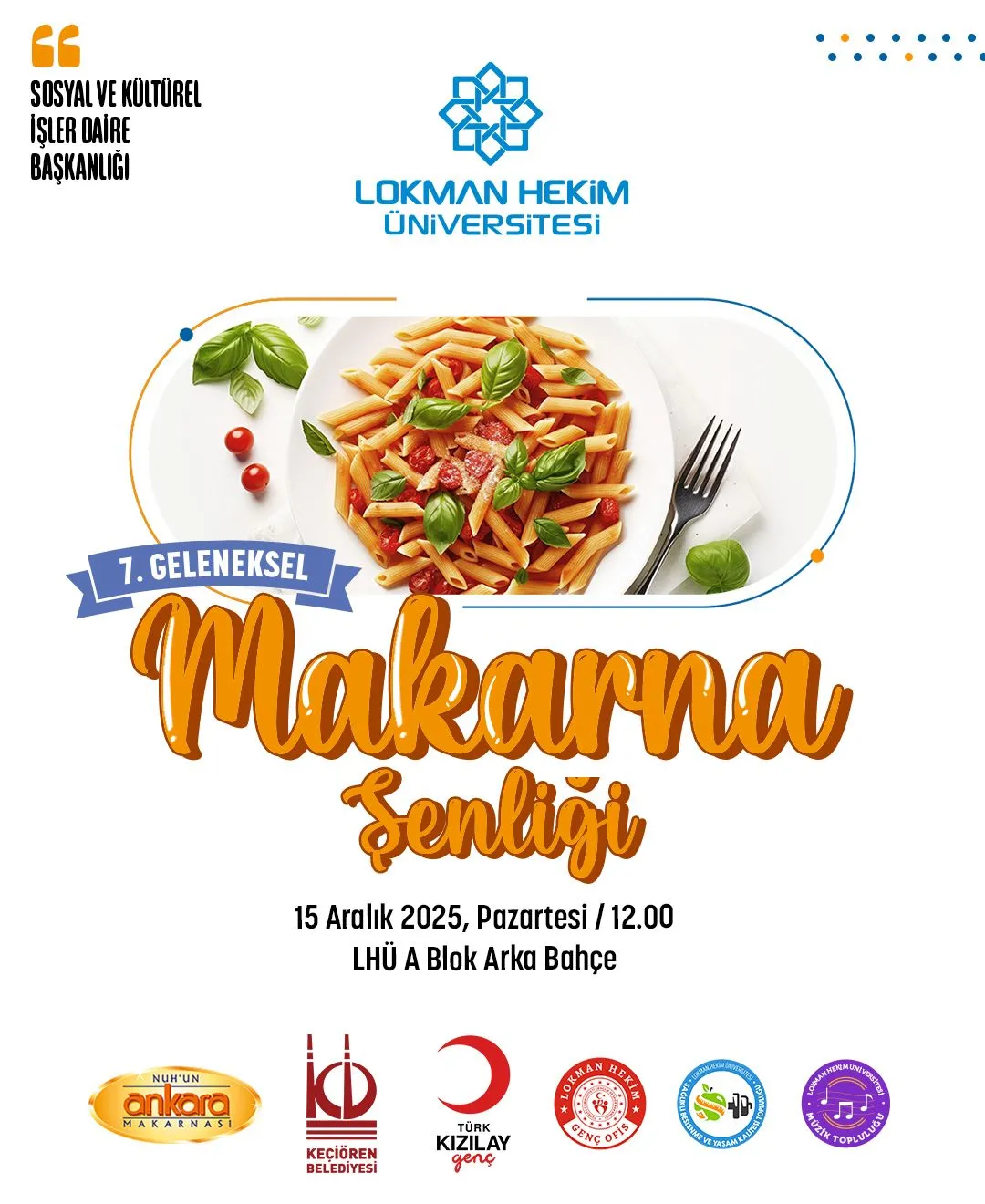 Lokman Hekim Üniversitesi Sosyal Kültürel İşler Daire Başkanlığı ve Genç Ofis koordinasyonunda 7. Geleneksel Makarna Şenliği, 15 Aralık 2025 Pazartesi günü saat 12.00’de A Blok arka bahçede gerçekleştirilecektir. Nuh’un Ankara Makarnası, Keçiören Belediyesi ve Genç Kızılay iş birliğiyle hazırlanan etkinlik, öğrencilerin bir araya geldiği keyifli bir sosyal buluşma niteliği taşımaktadır.