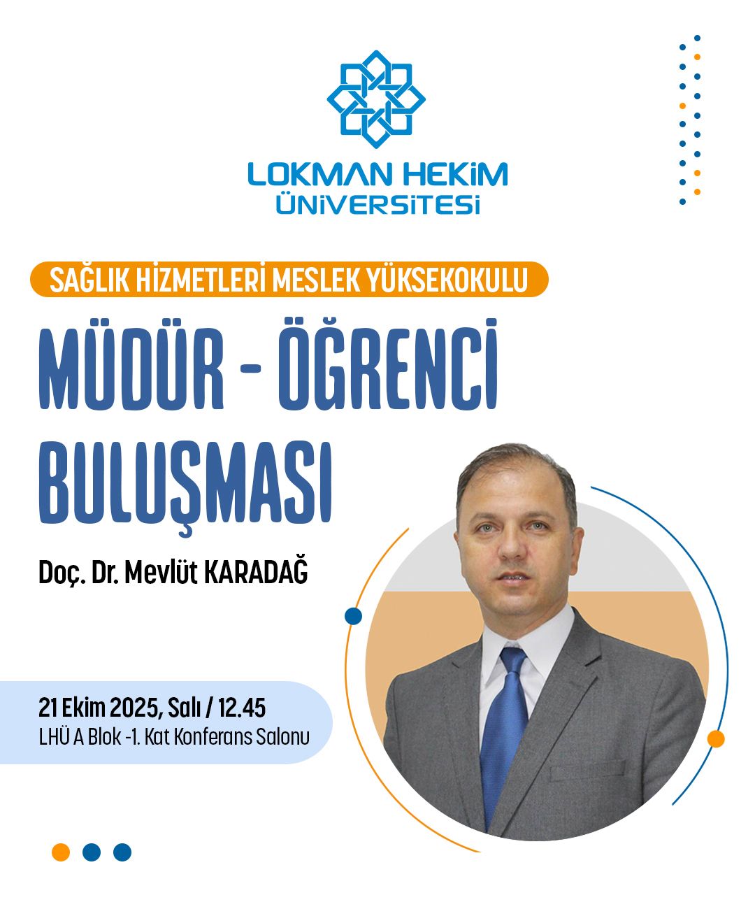 Lokman Hekim Üniversitesi Sağlık Hizmetleri Meslek Yüksekokulu’nun “Müdür–Öğrenci Buluşması” etkinliği, 21 Ekim 2025 Salı, saat 12.45’te LHÜ A Blok, -1. Kat Konferans Salonu’nda gerçekleşecektir ve buluşmada Doç. Dr. Mevlüt KARADAĞ öğrencilere hitap edecektir.